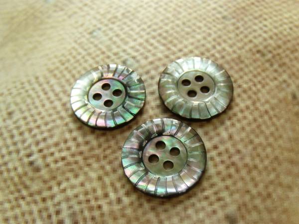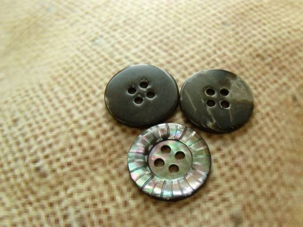 | ★商品説明★ | タイヤ?のような彫刻をしています。 25mm の黒蝶貝を 3個 セットです。 服のワンポイントに、かばん等のアクセントに と色々考えるのも楽しいですね。 黒蝶貝は深みのあるシルバー系のまばゆい光を放つ貝です。 世界的に人気のある大粒の南洋黒真珠の母貝として有名で、高級工芸品や装飾品として使われております。 天然物ですので、柄等は均一ではありません。 ご了承ください。よく掲載写真をご覧のうえお買い求めください。 ボタンを変えると驚く程、洋服のセンスがアップします。 一度おためしあれ。 | ||