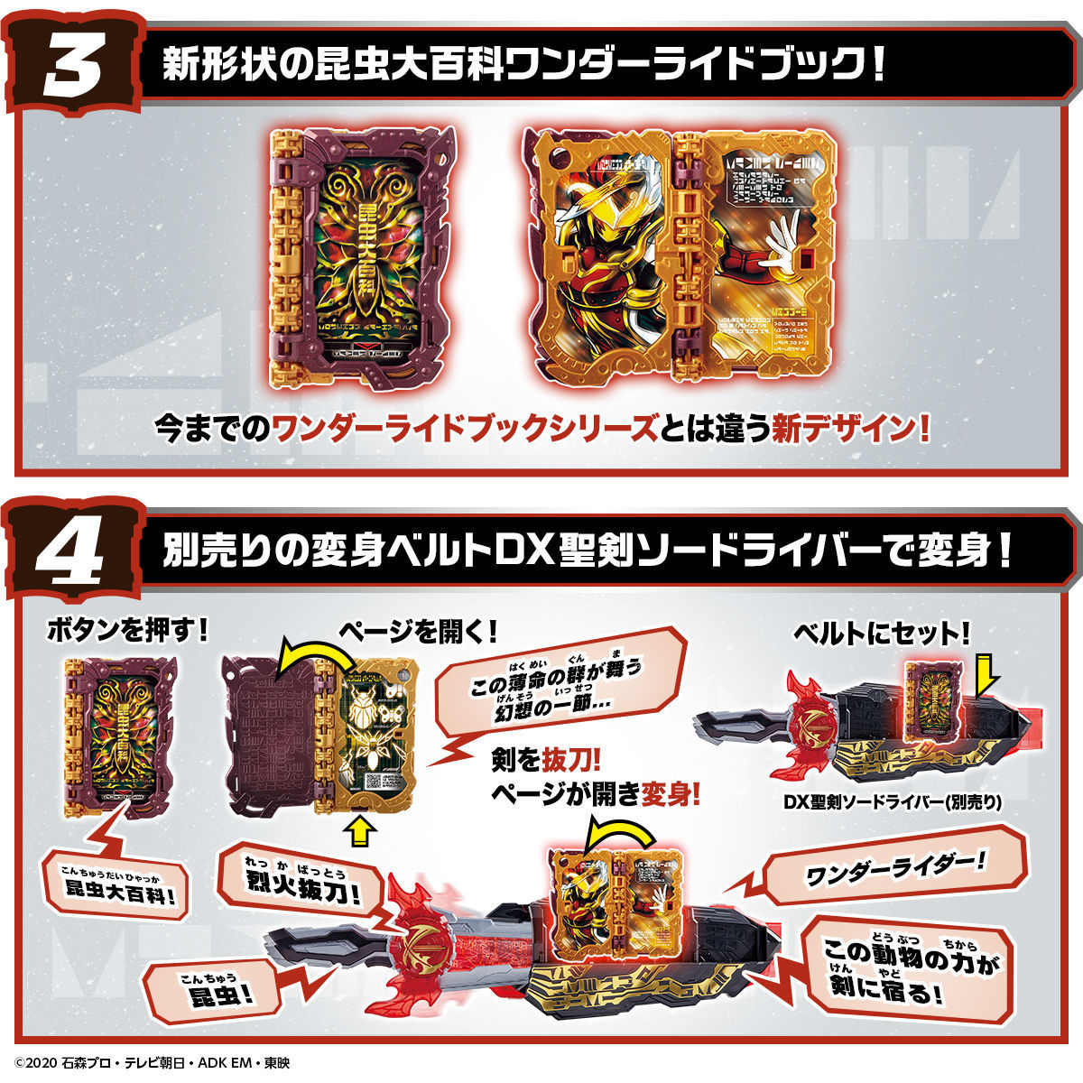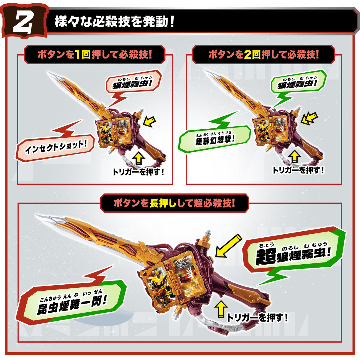 付属の昆虫大百科ワンダーライドブックのボタンを押し、ページを開くと音声が発動。 ワンダーライドブックをページが閉じた状態でDX煙叡剣狼煙にセットし、本体のトリガーを押すとページが開き、変身音が発動します。 必殺技ボタンを1回押してトリガーを押すとインセクトショット、必殺技ボタンを2回押してトリガーを押すと煙幕幻想撃、必殺技ボタンを長押ししてトリガーを押すと昆虫煙舞一閃という必殺技が発動します。 また、付属の昆虫大百科ワンダーライドブックは別売りの「変身聖剣 DX聖剣ソードライバー」と連動させて遊ぶことも可能です。 セット内容 煙叡剣狼煙本体…1 昆虫大百科ワンダーライドブック…1 取扱説明書…1