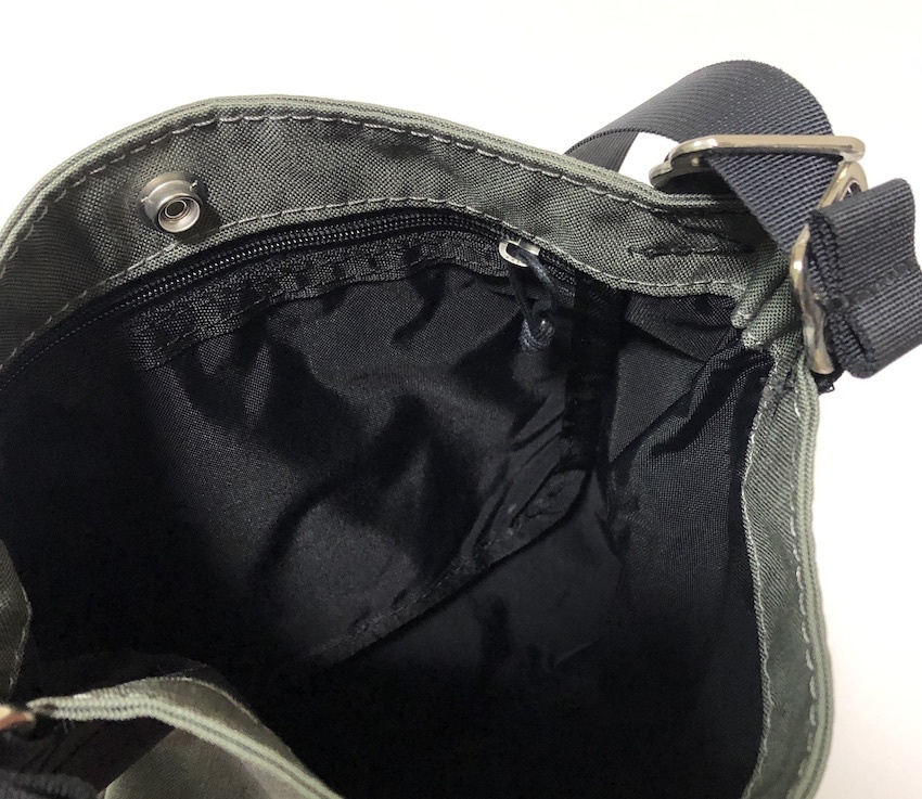 メインポケットはボタン留め、内部にはジップ付きの小物入れがあります。