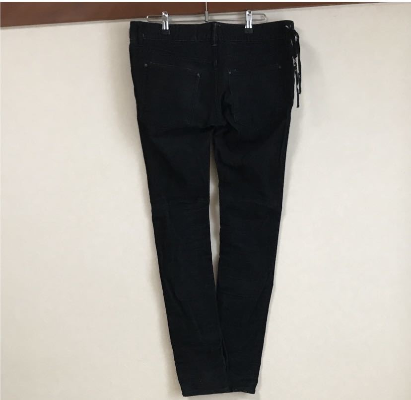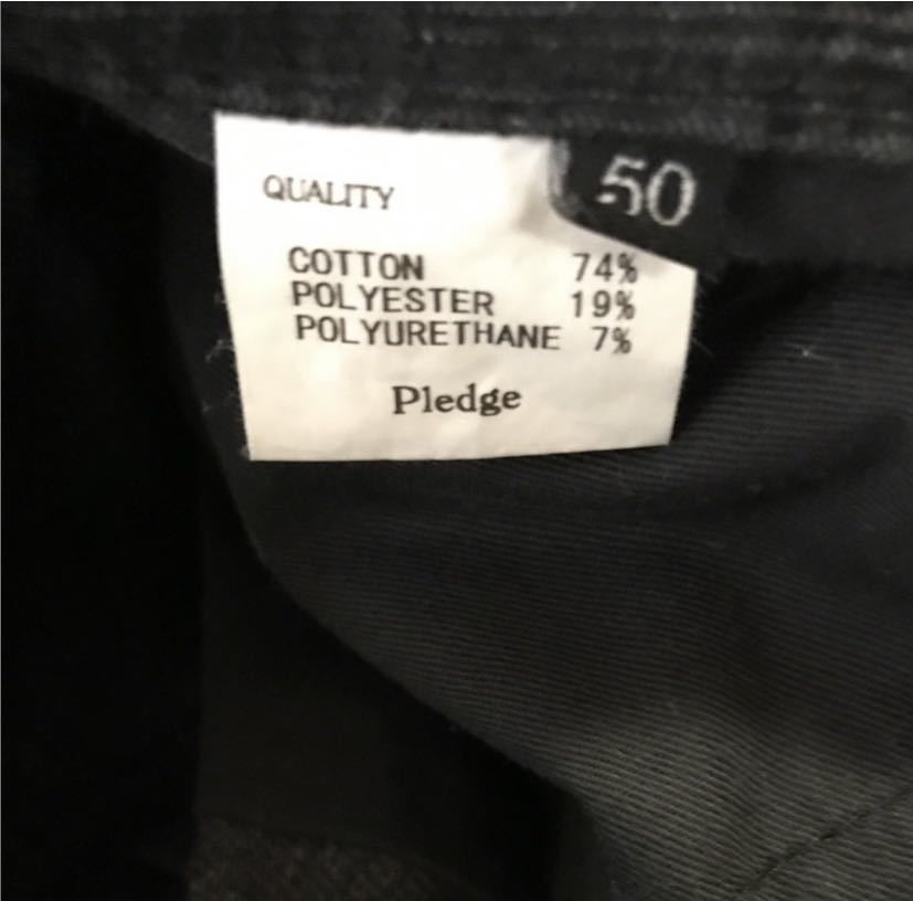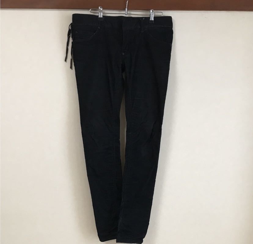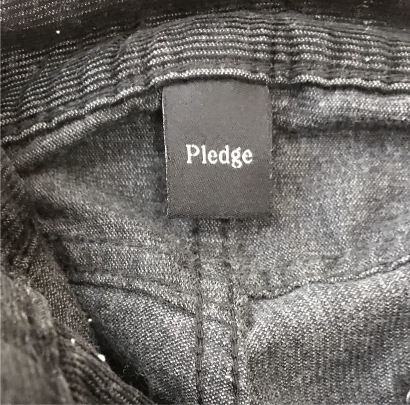 Pledgeのコーデュロイパンツです。色は黒、サイズは50で素人計りですが実寸ウエスト84cm、レングス86cm 股上20cm、裾幅16cmでした。多少の誤差はお許し下さい。プレッジらしい細身のきれいなシルエットです。シンプルなデザインですので流行に左右されることなく長く着用していただけると思います。状態は比較的綺麗な中古品です。全体的に着用感ございますが特筆するような大きなダメージはございません。全体的に生地の毛羽立ちと色落ちが少々ございます。。私感ですが十段階で九位の程度だと思います。タグなどの付属品は残っております。