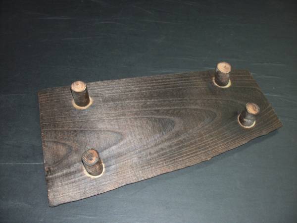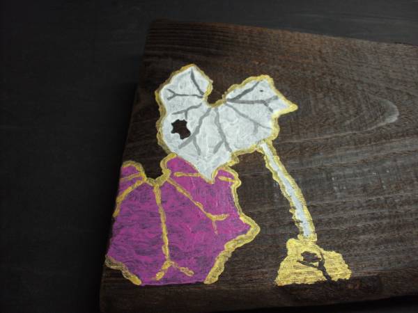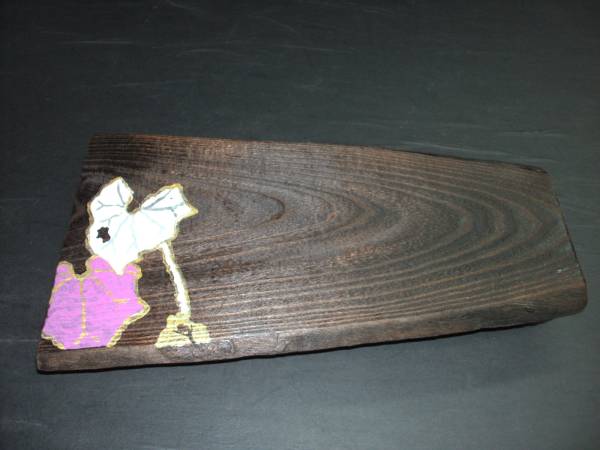 | 桐の一枚板を焼いて木目を浮き上がらせ、飾り台を作りました。材料の一枚板の自然の形を生かして飾り台を作っています。そしてその黒い焼桐を背景として色々な色の蕗を描き飾り台のワンポイントとしました。 サイズ:32cmx18cmx4cm この度は思いきった値段にしました。 |