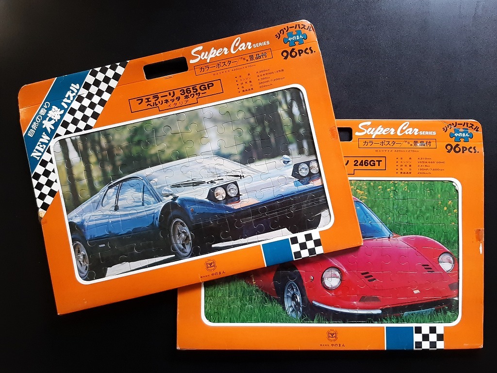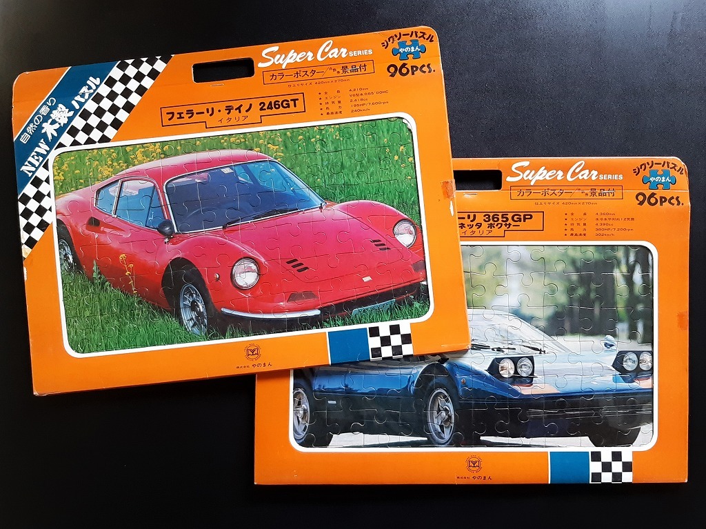 '70s 当時物 紅い フェラーリ ディノ スーパーカーパズル 木製 未使用 2セット 特大カード入り!☆ Ferrari 365GT/BB ベルリネッタボクサー