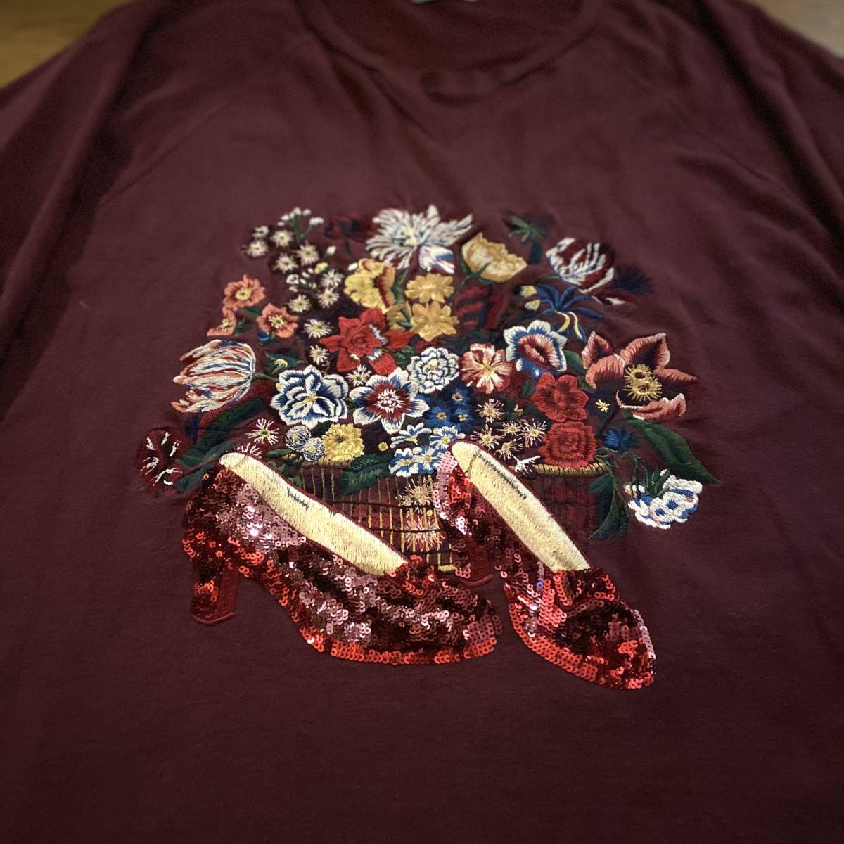 刺繍でフラワーバスケット、スパンコールと刺繍で靴が表現されています。
