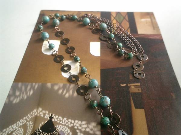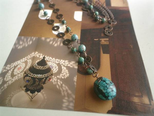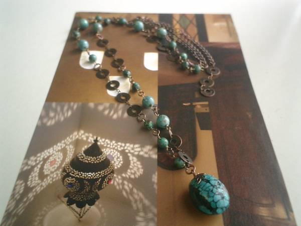 ノスタルジック・スタイル・・シリーズです♪サハラに恋して・・神秘的なターコイズのネックレスです♪ダークブルーのターコイズにデザインチェーンを合わせてアフリカン・モダンな表情です♪6ミリ、8ミリの丸玉のターコイズにトップは23×18ミリ位です♪長さは全長93センチ位で調節自由です♪♪お揃いのブレスレットも出品しています♪♪シンプルで飽きのこないいつまでも着けられるデザインを考えて作りました!ハンドメイドをご理解頂いてノークレーム、ノーリターンでお願いします