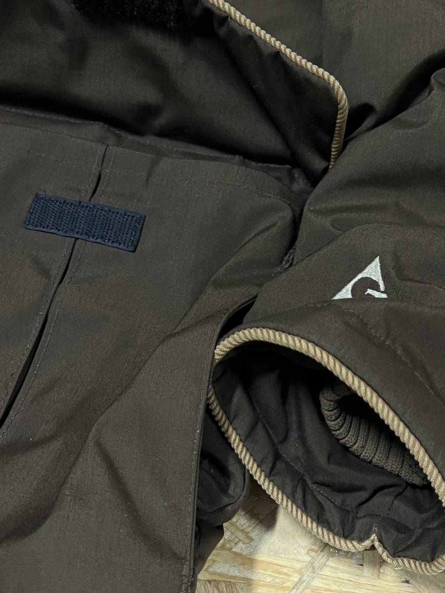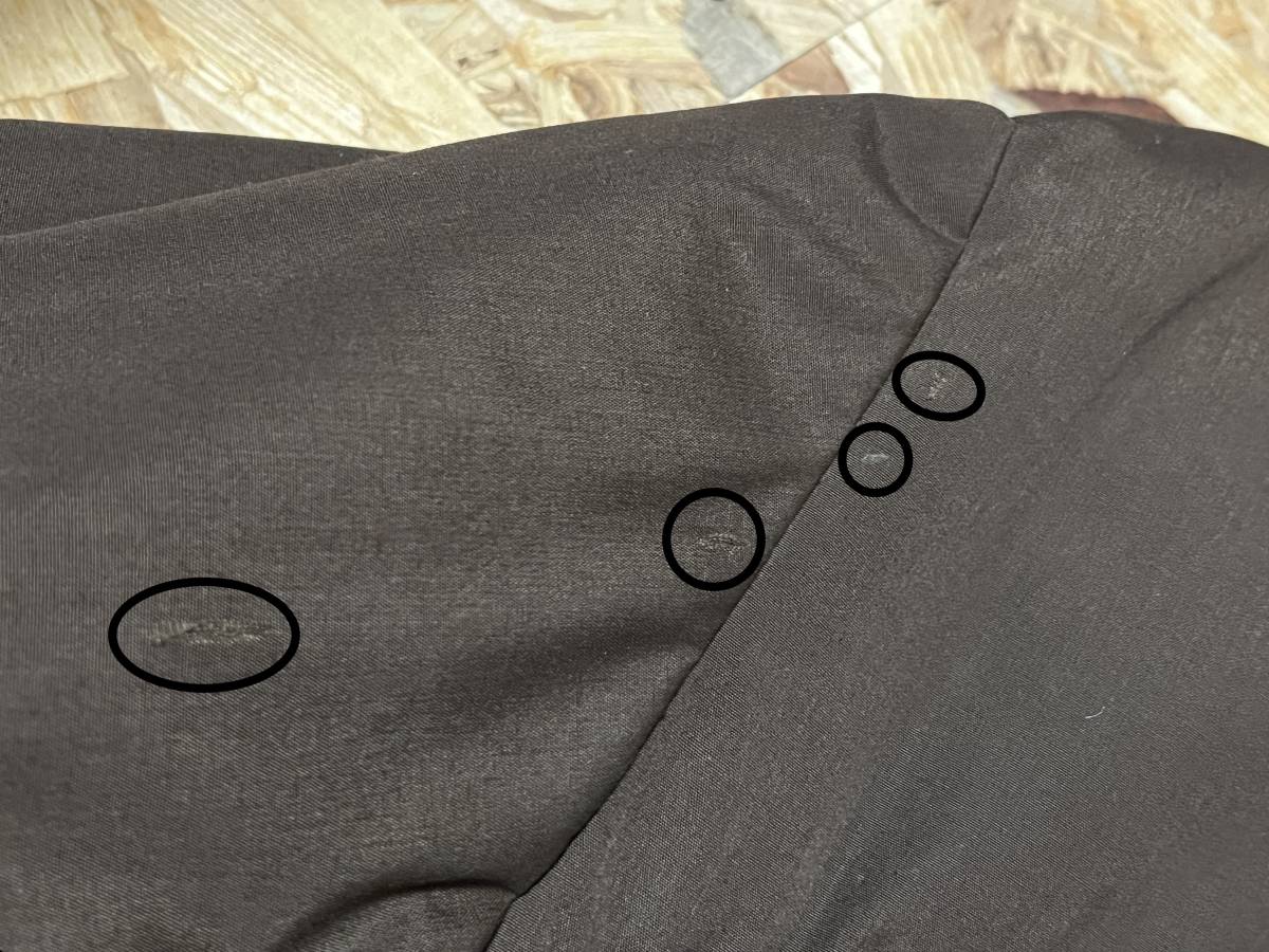 9枚目の写真、左後ろ肩下と左袖に4箇所、数ミリ~1cm程の目立たない傷がありますが羽毛の漏れなどは無く着用に問題はありません。