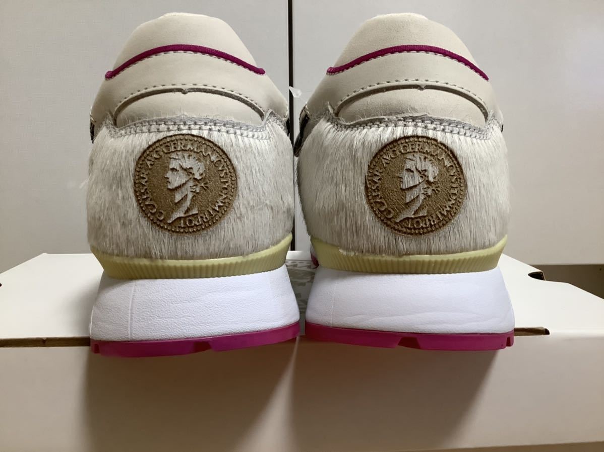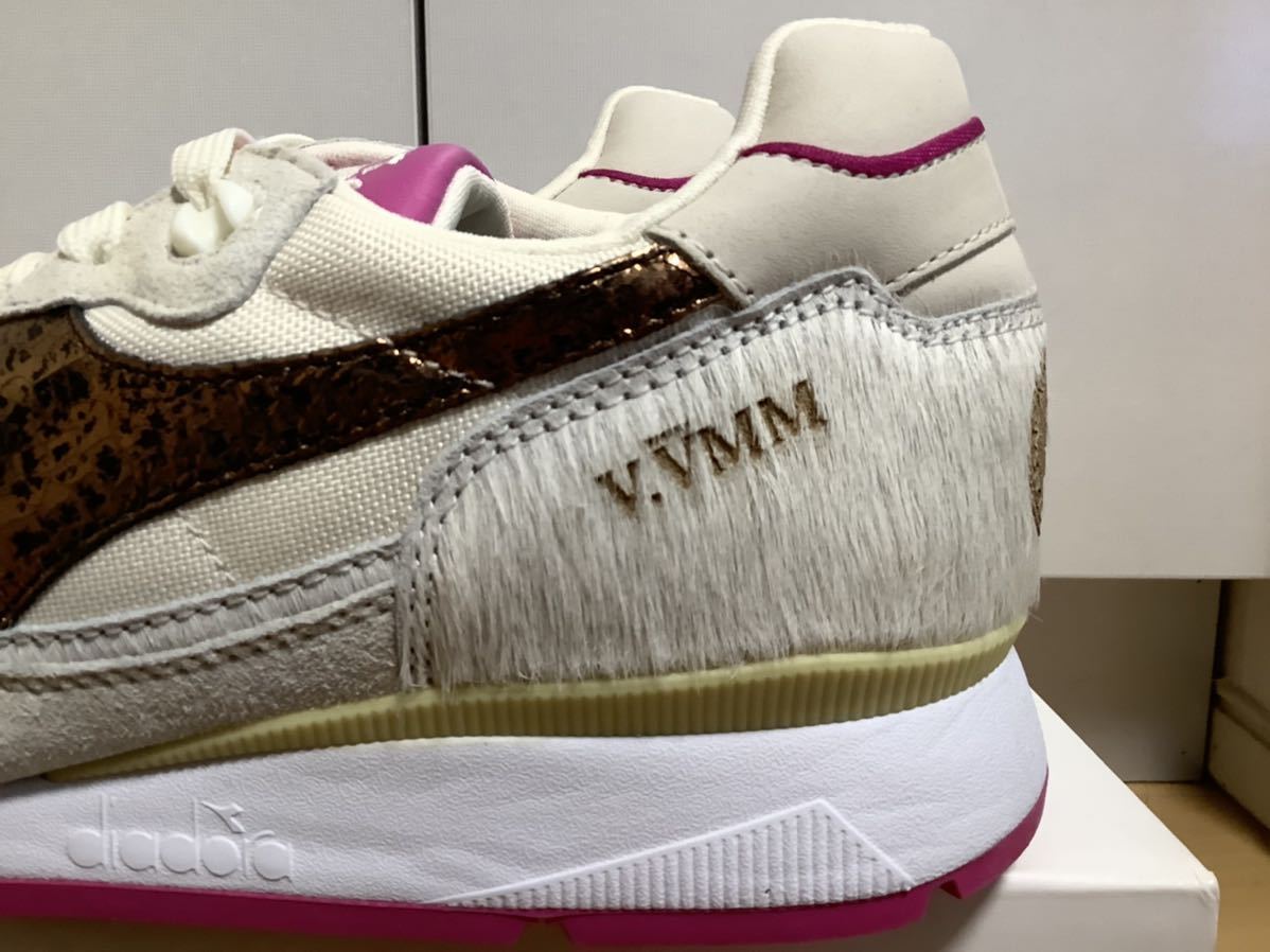 『V7000 “Caligula”』のCaligula(カリクラ)とは、第3代ローマ帝国皇帝Julius Caesar(ユリウス・カエサル)のニックネームであり、アッパーのオフホワイトカラーは古代ローマの代表的な衣服であるトーガからインスパイア。ヒール部分には、本人が乗っていたとされる馬の毛をイメージしたハラコ素材を使用し、サイドに配したDIADORAを象徴する羽のマークにはゴールドのパテントレザーを用いることで、ラグジュアリーな雰囲気に仕上げられています。