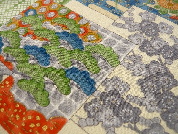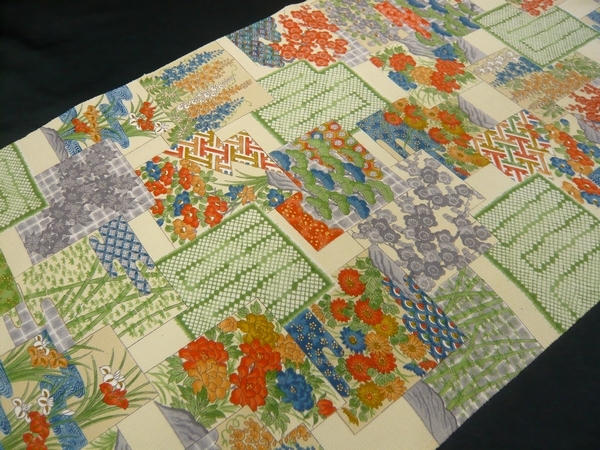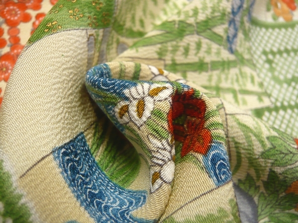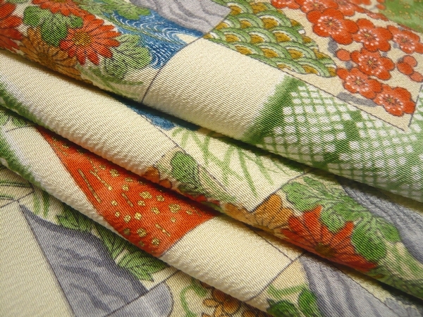 着物はぎれ 端切れ 正絹 ちりめん 縮緬 美品 源氏香と花 155㎝ 手芸 細工 小物づくり 半襟にも