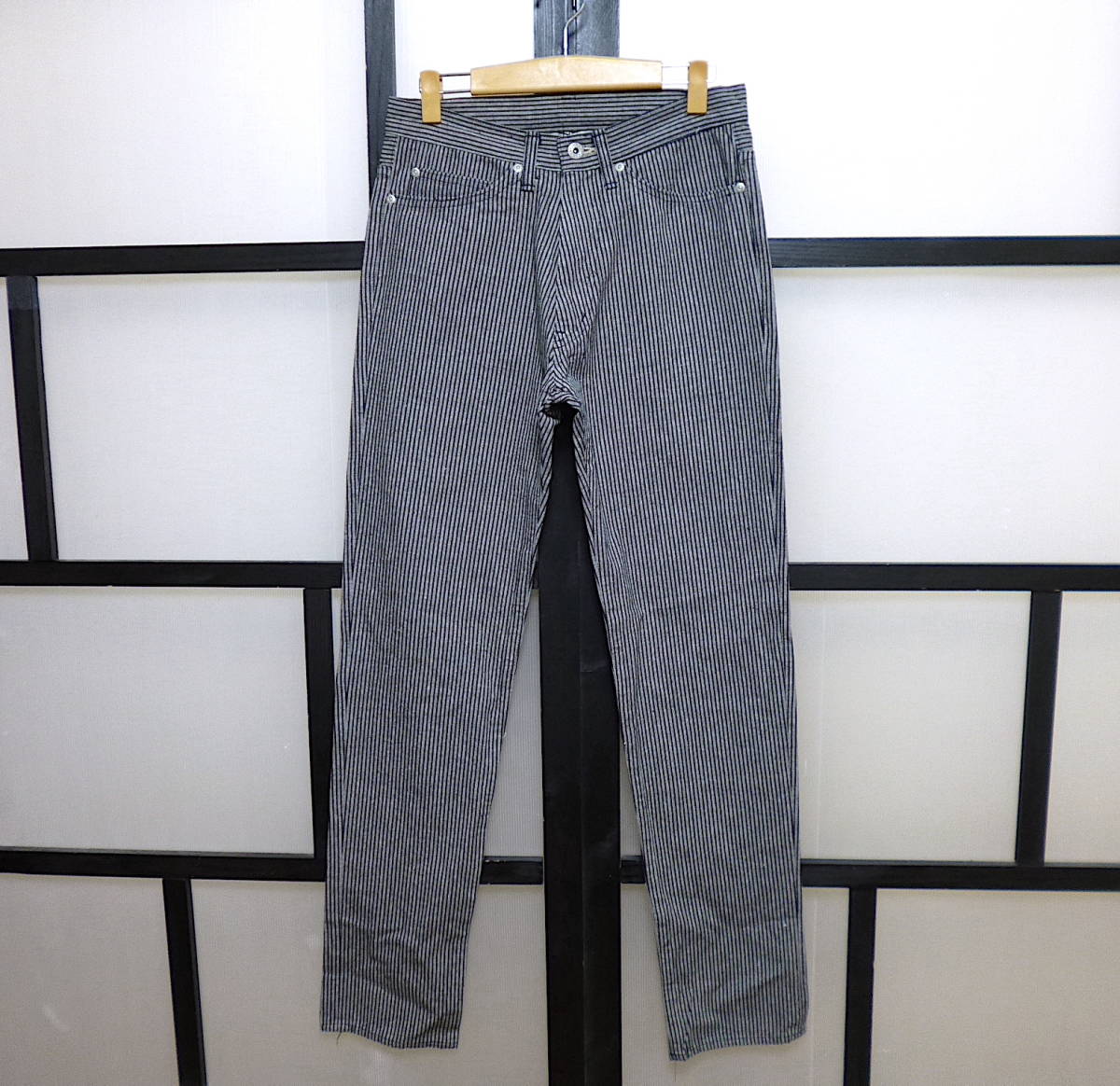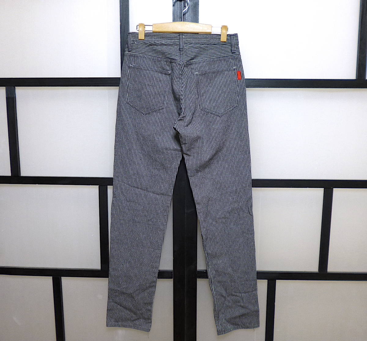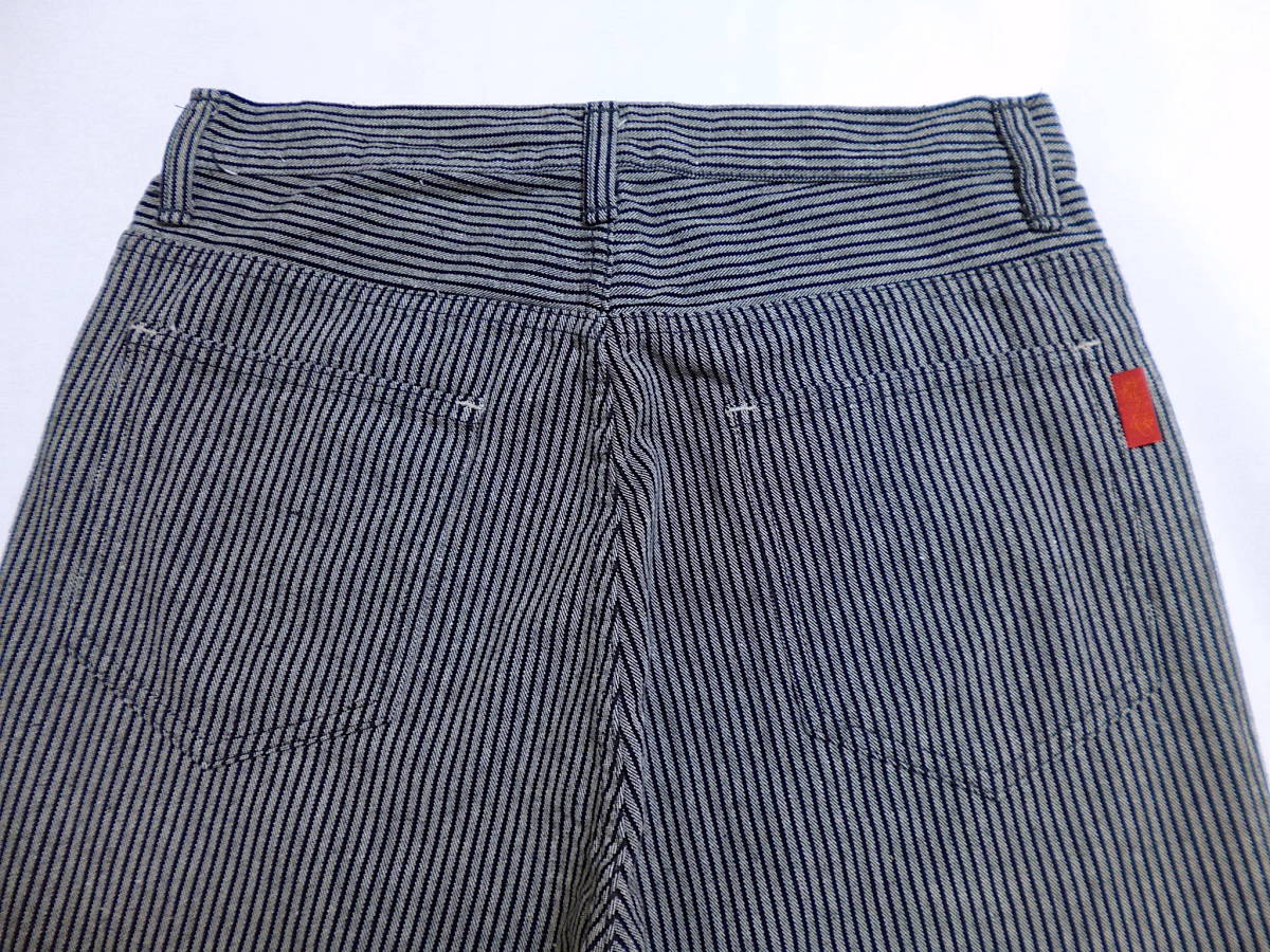 | 実寸サイズ | ウエスト(平置き計測後×2)およそ76センチ、ヒップ幅およそ49センチ、モモ幅(股の辺り)およそ29.5センチ、スソ幅およそ17.5センチ、股上(フロント部分のウエストから股のキリカエまで)およそ27.5センチ、股下(股のキリカエからスソまで)およそ84.5センチ。(たるみを無くす為軽く引っ張る感じで計測しています。多少の計測誤差はご容赦願います。) |