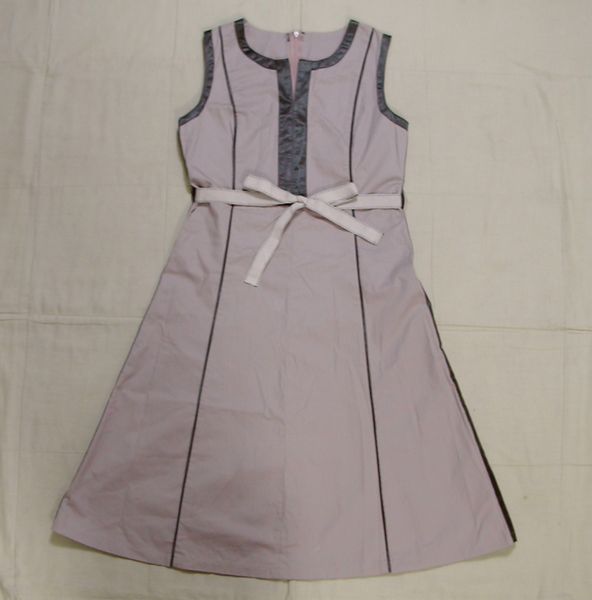 茶系リボンテープで縁取られた薄い紫の薄手素材でリボンベルトが付いたノースリーブワンピースです。