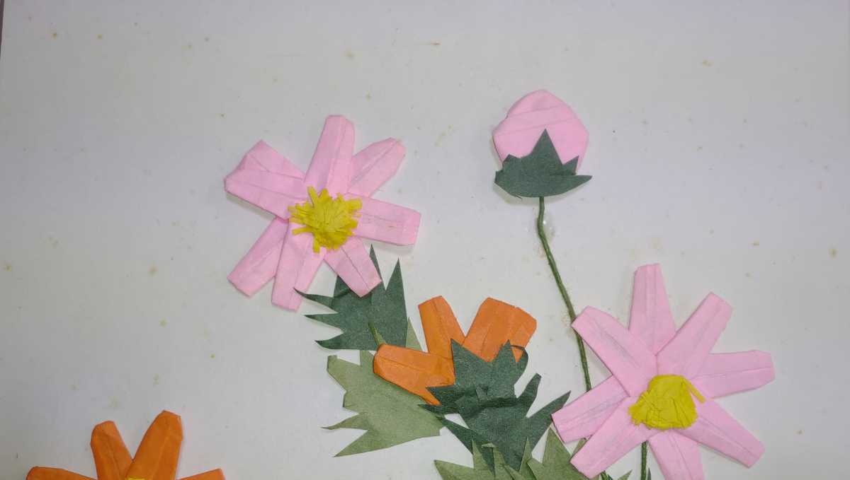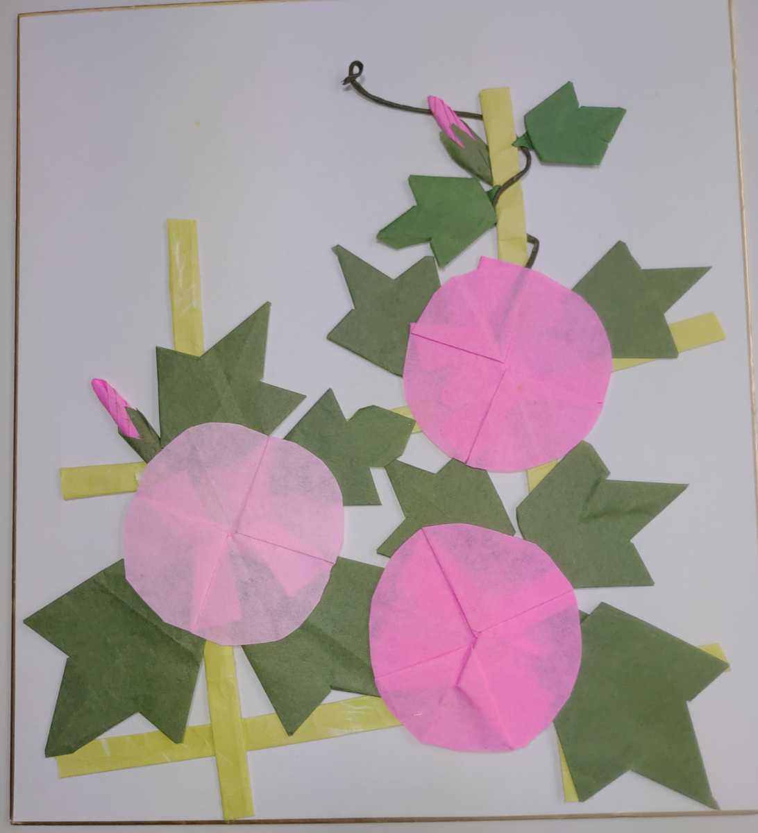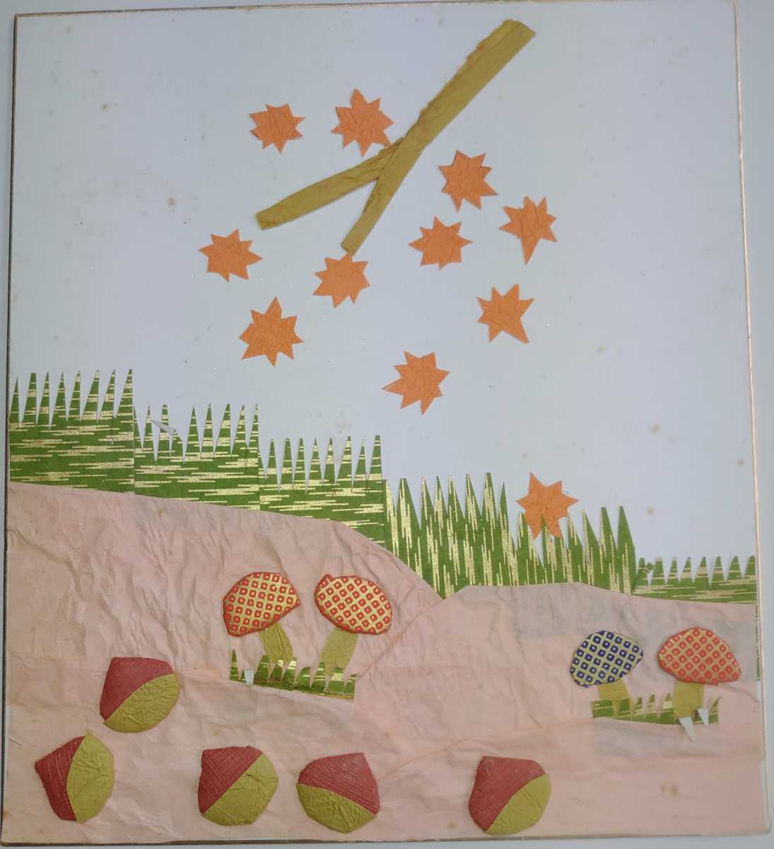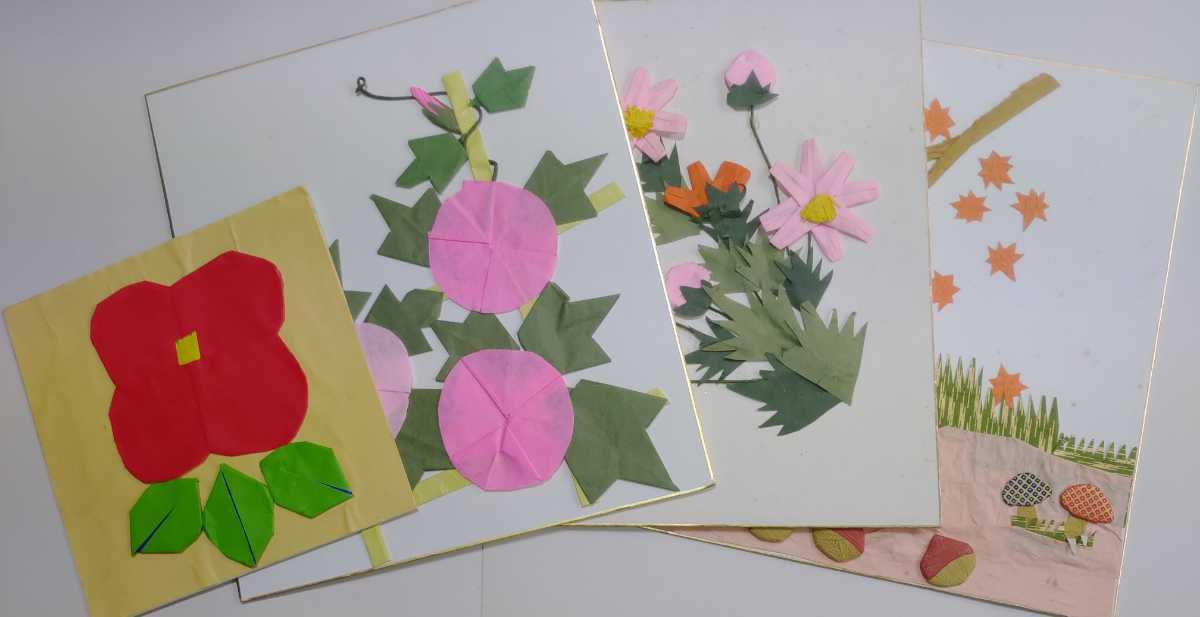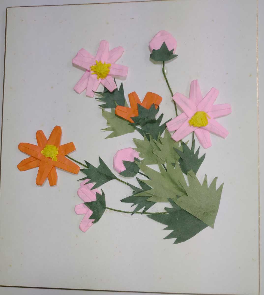 朝顔や椿等植物の特徴を表現したものですが、コスモスや紅葉の作品には台紙部分にやや汚れがあります。