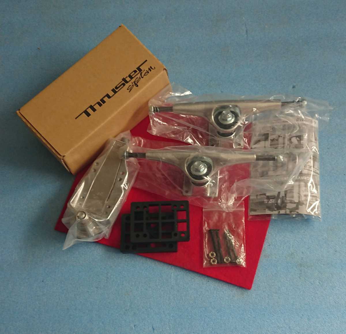 ■スラスターシステム1はセッティングしますとフロントトラックがウィ-ル一個分内側にセッティングになりますのでロンスケ(90cm前後位以上)の板に合いますがスラスターシステム②③は ノーマルセッティング位置が同じになりますので ロンスケは勿論 長さを問いません