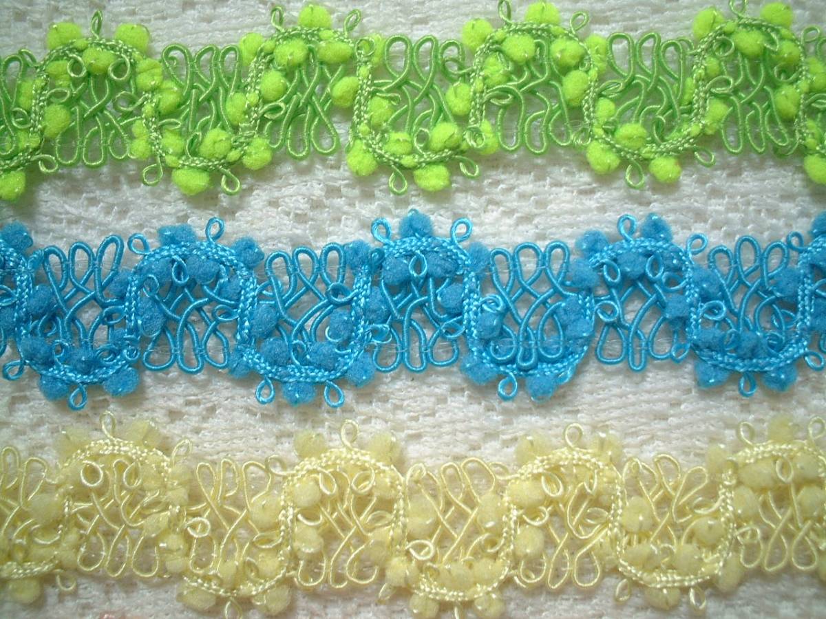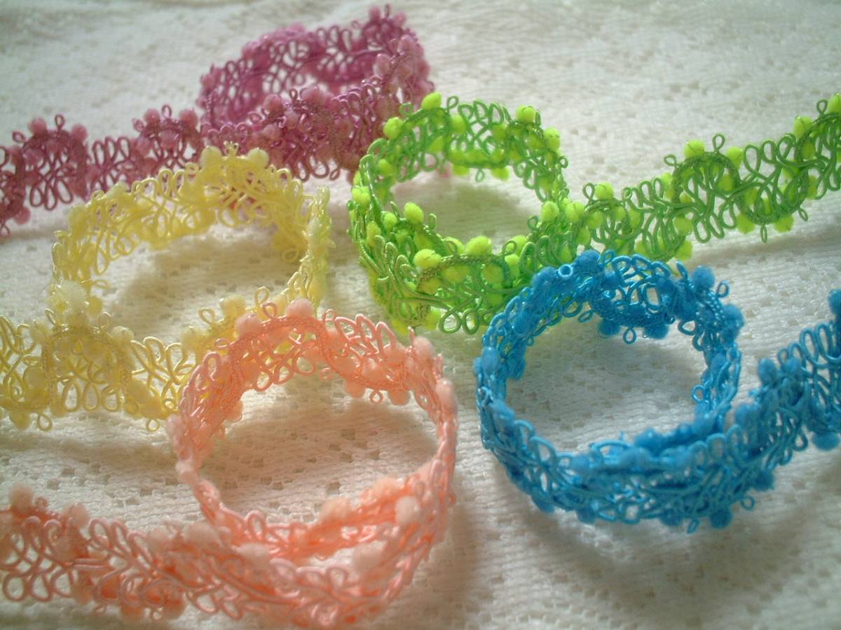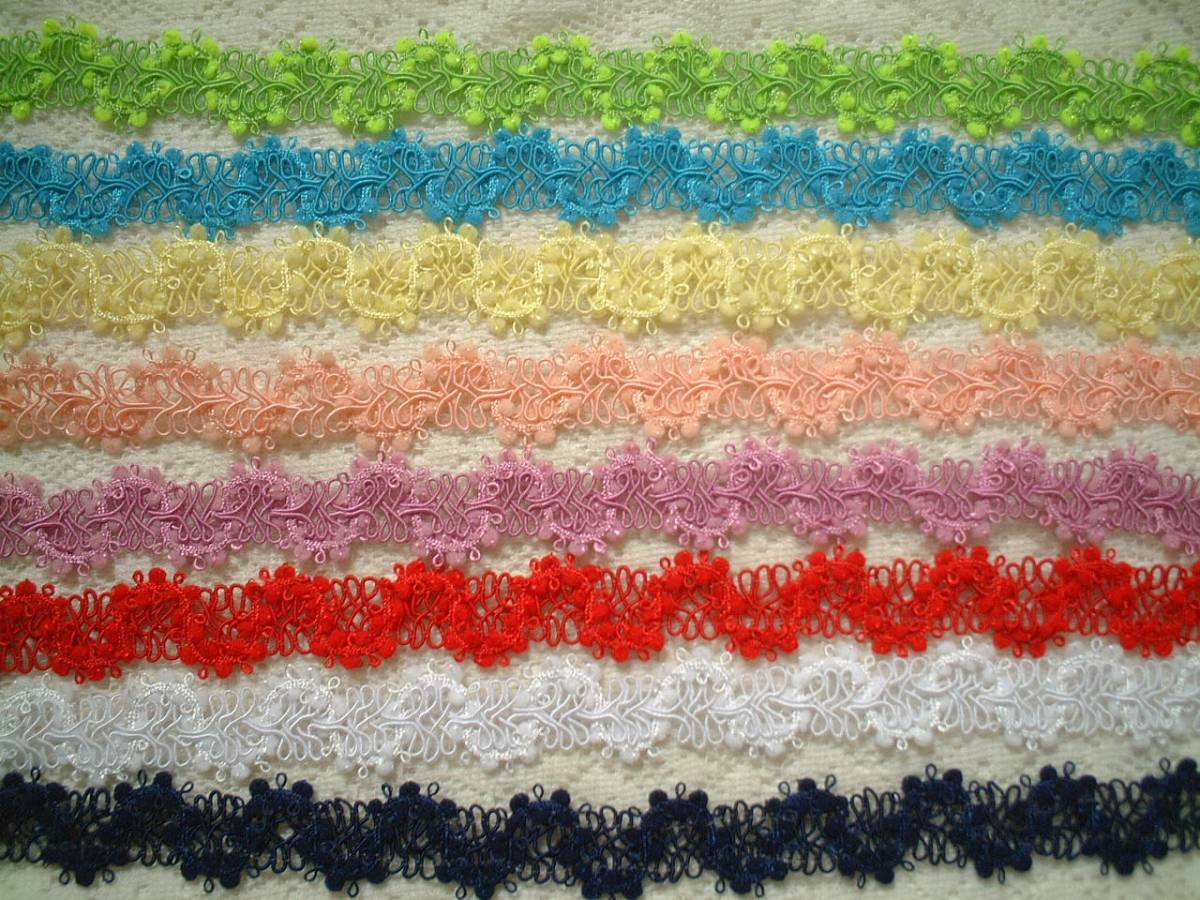 ご覧頂きありがとうございます。 きれいなブレードレースです。 1色お選びいただきお知らせください、延長可能です。 全体巾約2cm*ポンポンのサイズ約2.5mm お取り置きも承りますので、落札後に1度必ずご連絡くださいませ。 オンラインショップとの同梱も可能です。 | ||