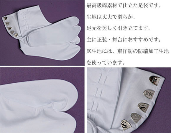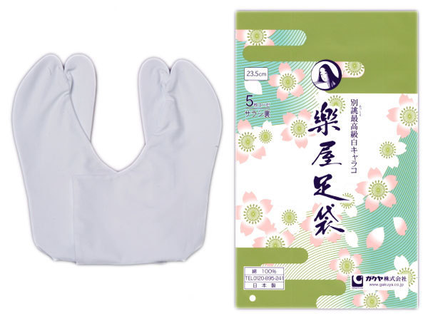 | 最高級綿素材で仕立た足袋です。 双糸で織り上げた生地でなめらかな仕上がり で自信を持っておすすめする最高級品です。 本商品は「別誂えキャラコ」を、5枚コハゼ として仕立てた足袋です。 主に正装用や、舞台用としておすすめです。 底生地には東洋紡防縮加工生地を使用し、 楽屋足袋のこだわりの縫製が施されています。 ■弓 掛 け 弓なりの掛糸でより良く足にフィット ■千鳥縫い 底生地との縫製を補強、ほつれを防止 ■叉絡縫い 力のかかる指叉部分を補強 ■素材 表・裏・底/綿 100% 日本製 ■サイズ 22cm ■宅配便 メール便 | ||