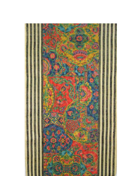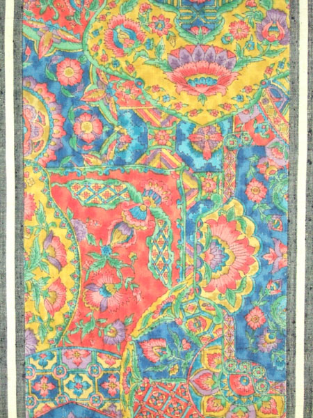 結城縞に本更紗加工名古屋帯 未仕立品