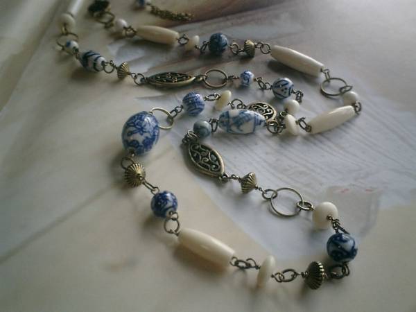 アート・ロマン主義・・シリーズです♪古色藍色に魅せられて・・陶器ビーズとボーンのネックレスです♪陶器ビーズの深い藍色に魅せられて作りました♪18×13ミリ、18×10ミリ、8ミリ、6ミリの丸玉の陶器ビーズに6ミリの丸玉、18×7ミリ、25×9ミリ、8×3ミリの大きさ違い、デザイン違いのボーンやデザインメタルチャームを合わせてひっそりロマンチックしています♪長さは全長120センチ位で調節自由です♪2連にされても可愛いです♪お揃いのネックレスやブレスレットやピアスも出品しています♪♪シンプルで飽きのこないいつまでも着けられるデザインを考えて作りました!ハンドメイドをご理解頂いてノークレーム、ノーリターンでお願いします