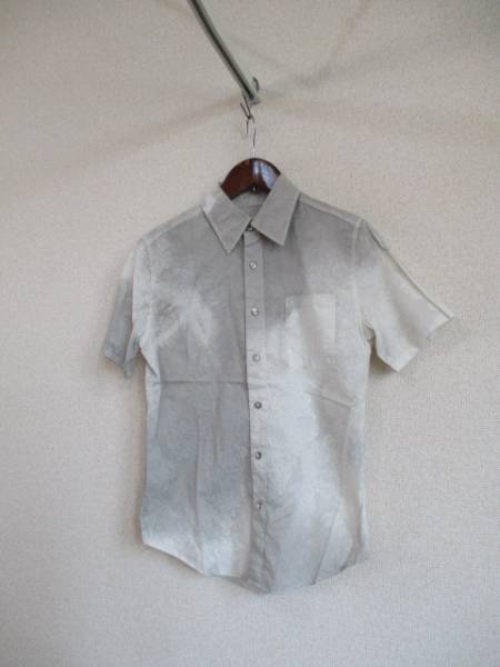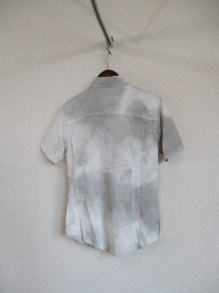 | 商品紹介 | レースのようなプリントが入った半袖シャツです。 スッキリとした形で、後ろ側のみタックでウエストが少しシェイプされた形です。 基本グレーで、白っぽい箇所とグレーが濃い部分があり、元々のデザインとして 染め方が滲んだようになっています。 (色褪せ・色移りではありませんので予めご了承ください。) 《素材》 綿100% |