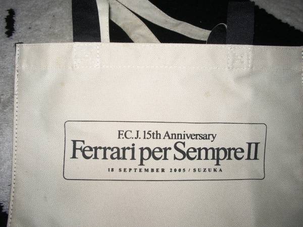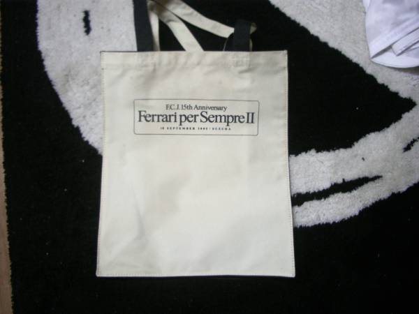 フェラーリ クラブ オブ ジャパン 15周年記念バックです(2005年9月鈴鹿)。裏面は無地です。サイズ 30x36x14CM。未使用ですが保管品ですので神経質な方はご遠慮ください。2ヶ所のわかりにくいしみが有ります。NC,NRでお願いします。