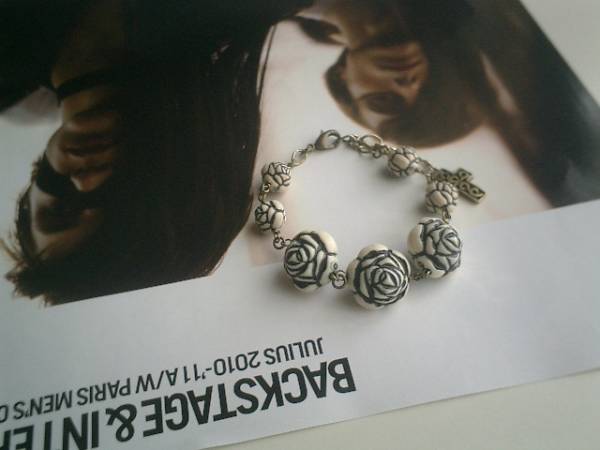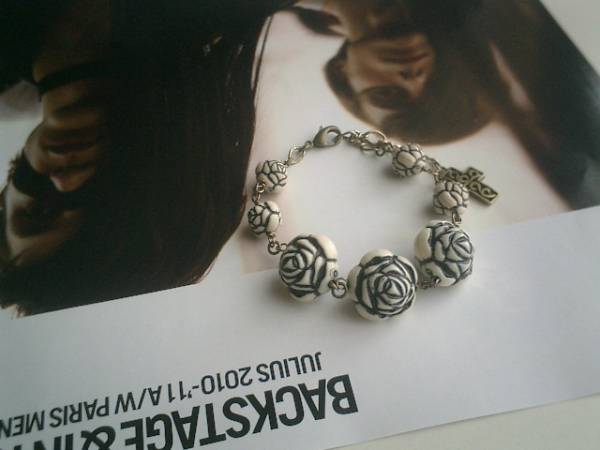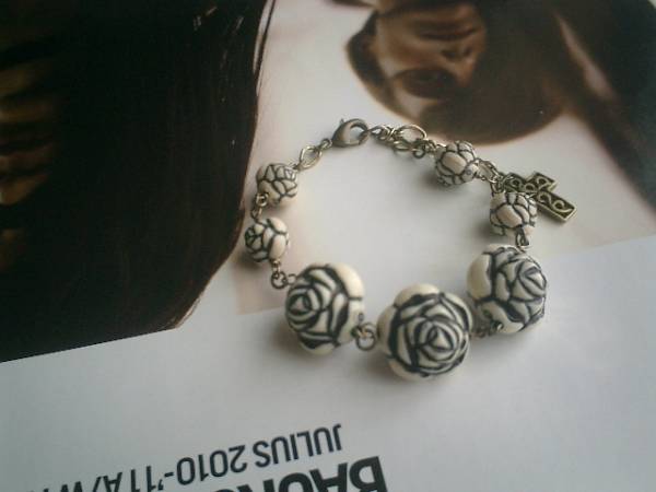 ずっとお気に入り・・シリーズです♪シックな薔薇・・シックな薔薇のブレスレットです♪甘すぎないアイボリーホワイトの樹脂薔薇は10ミリと14ミリ位の大きさ違いです♪さりげなくロマンチックな表情です♪♪長さは全長23センチ位で調節自由です♪お揃いのネックレスも出品しています♪シンプルでいつまでも着けられるデザインを考えて作りました!ハンドメイドをご理解頂いてノークレーム、ノーリターンでお願いします