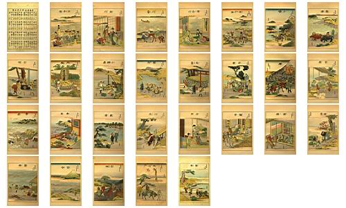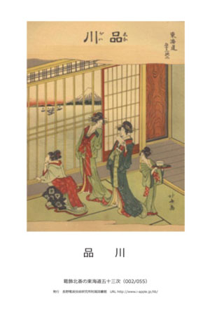 東海道五十三次でもっとも有名なのは歌川広重で、べつに大正7年の東海道と広重の五十三次を比較したポストカードとして出品しておりますので、参考ください。この北斎画は、風景よりも、人の風俗を主体とした画風になっており、江戸時代の生活が鮮やかに描かれています。 目次 日本橋 品川 川崎 神奈川 保土ヶ谷 戸塚 藤沢 平塚 大磯 小田原 箱根 三島 沼津 原 吉原 蒲原 由比 興津 江尻 府中 鞠子 岡部 藤枝 島田 金谷 日坂 掛川 袋井 見付 浜松 舞坂 新居 白須賀 二川 吉田 御油 赤坂 藤川 岡崎 池鯉鮒 鳴海 宮 桑名 四日市 石薬師 庄野 亀山 関 坂下 土山 水口 石部 草津 大津 三条大橋 などから、選んで頂けます。