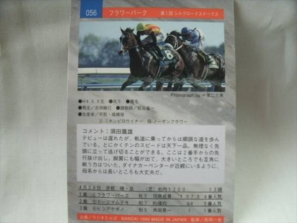 | ☆☆☆商品説明☆☆☆ 【メーカー】 バンダイ 【シリーズ】 96年上半期サラブレッドカード 【番号】 056 フラワーパーク 【数量】 1枚 サラブレッドカードの第2弾96年上半期カードになります。 |