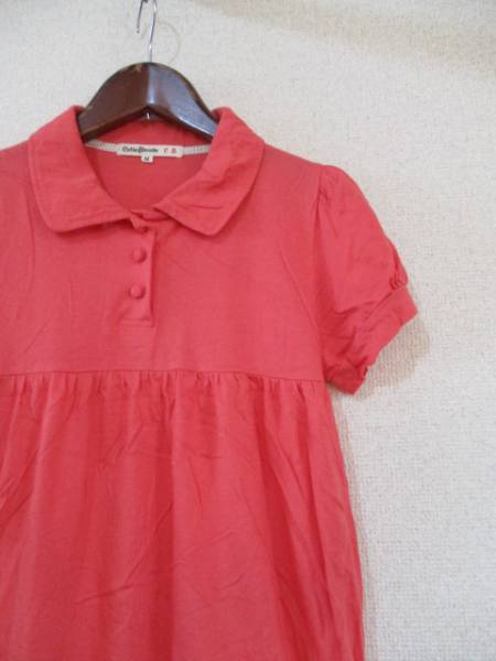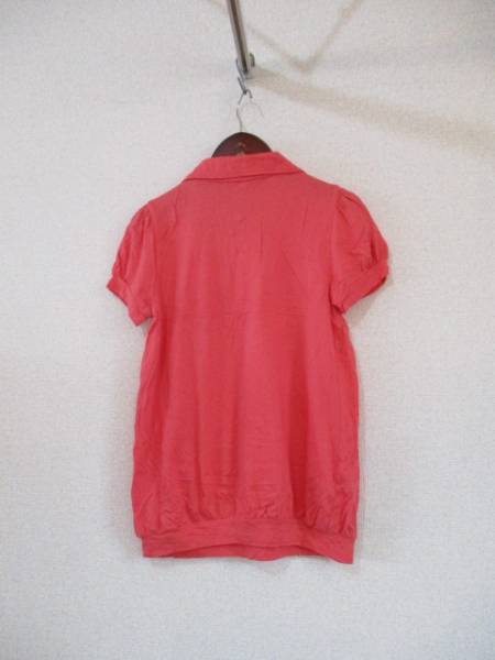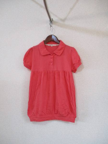 | 商品紹介 | ポロシャツ型の半袖カットソーです。 少し丸っぽい襟やくるみボタン、胸下のふんわりとした切替え等 かわいらしいデザインです。 色は少しオレンジがかったピンクです。 《素材》 本体:綿50% レーヨン50% 水玉部分:綿100% |