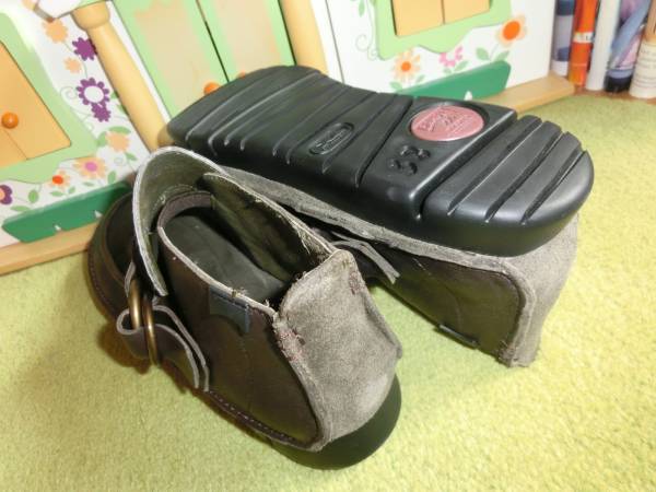 但し、かかと部分は裏革の明るい焦げ茶色、甲あて部分はこハラコの焦げ茶色。