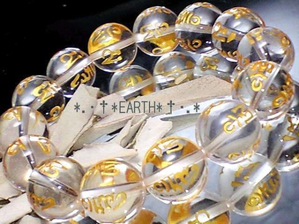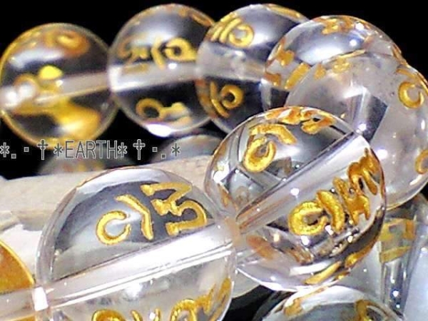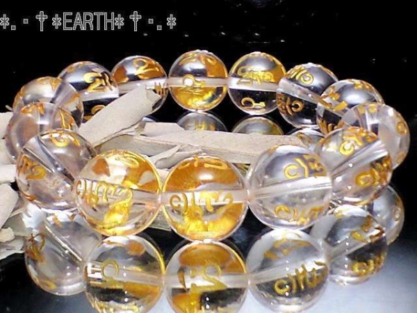 天然石★14ミリ金色彫り六字真言梵字水晶AAAクリスタル 数珠 | |