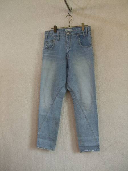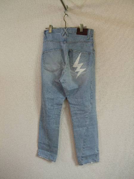 | 商品紹介 | 太腿はゆったり、裾に向かって細くなるテーパードデニムです。 脚の部分は斜めに縫い目が入っていて、後ろポケットの 稲妻のような白いプリントがデザインのポイントになっています。 股上が深めで、サルエルっぽい形です。 色はブリーチされていて薄いブルー、ポケットの端等、部分的に ダメージ加工が施されています。 《素材》 綿100% |