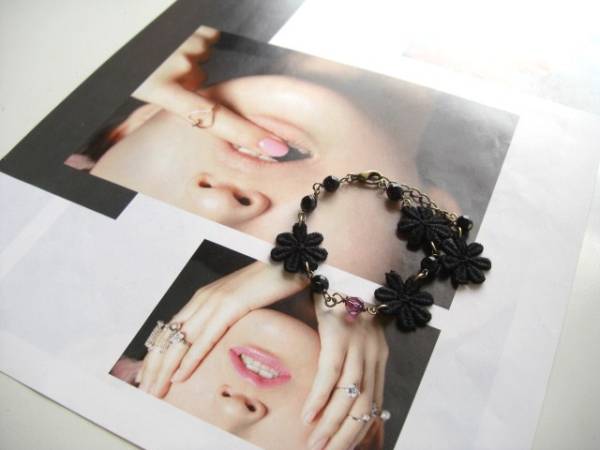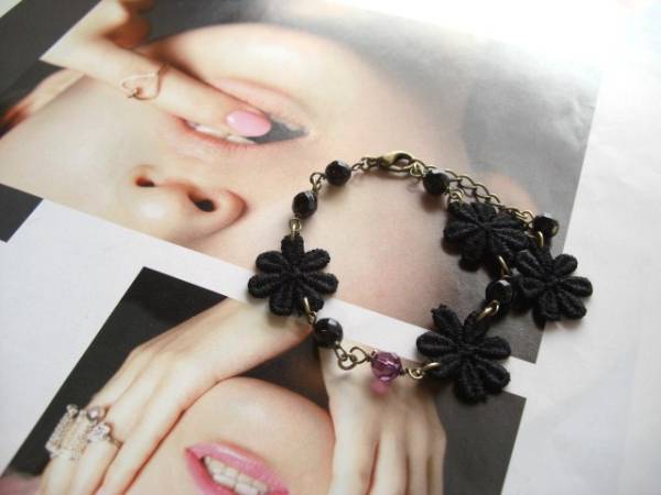 アンニュイ気分で・・シリーズです♪ジャンヌの首飾り・・シックなオニキスと黒のレースのお花のブレスレットです♪6ミリのラウンドカットのオニキ スに20ミリ位のレースのお花やスワロのアメジストを合わせて可憐な表情です♪長さは全長22センチ位で調節自由です♪お揃いの ネックレスも出品して います♪シンプルで飽きのこないいつまでも着けられるデザインを考えて作りました!ハンドメイドをご理解頂いてノークレーム、ノーリターンでお願いします