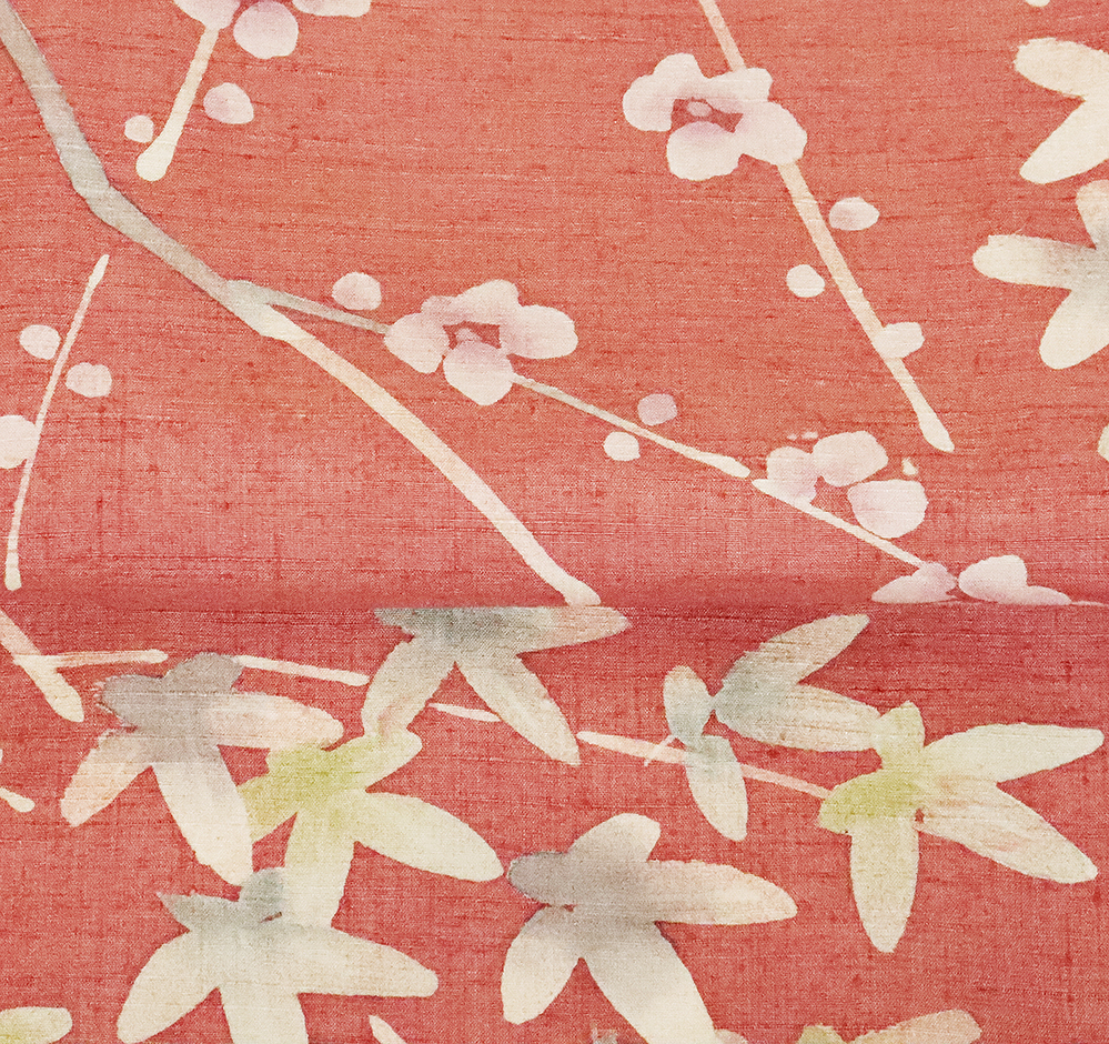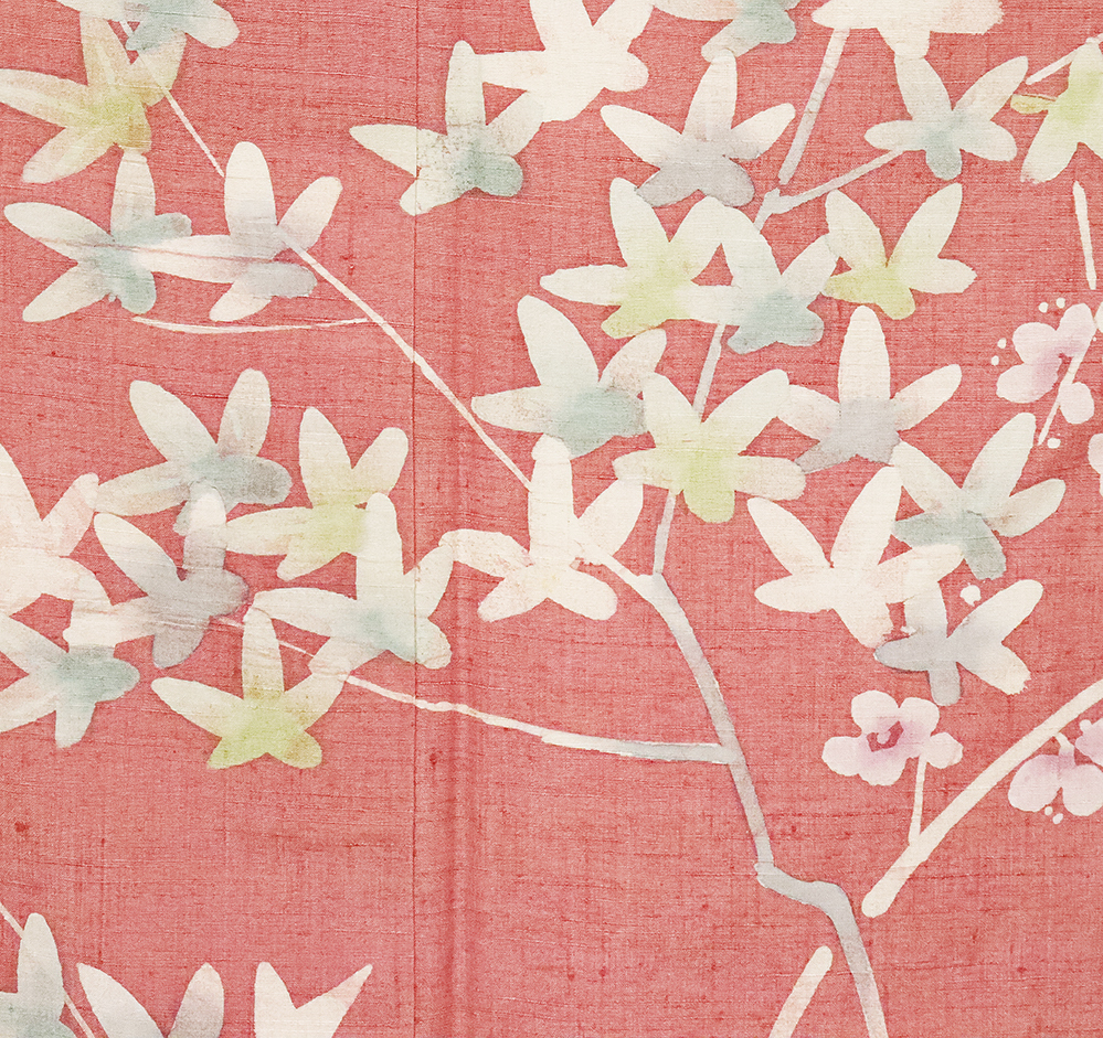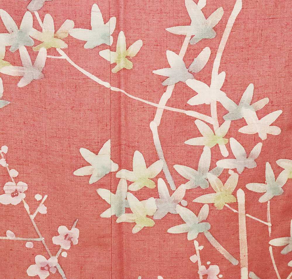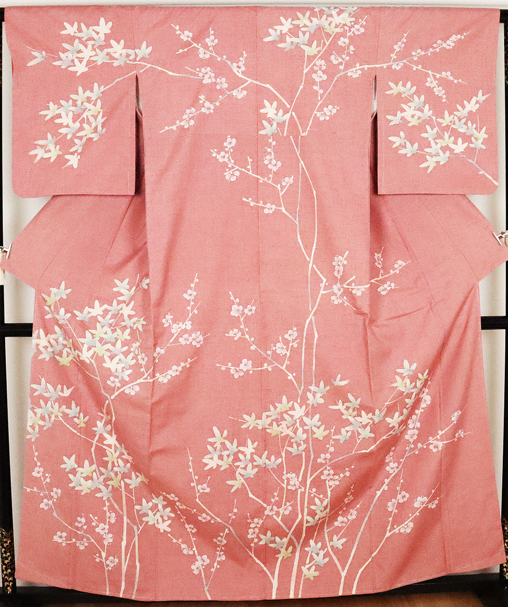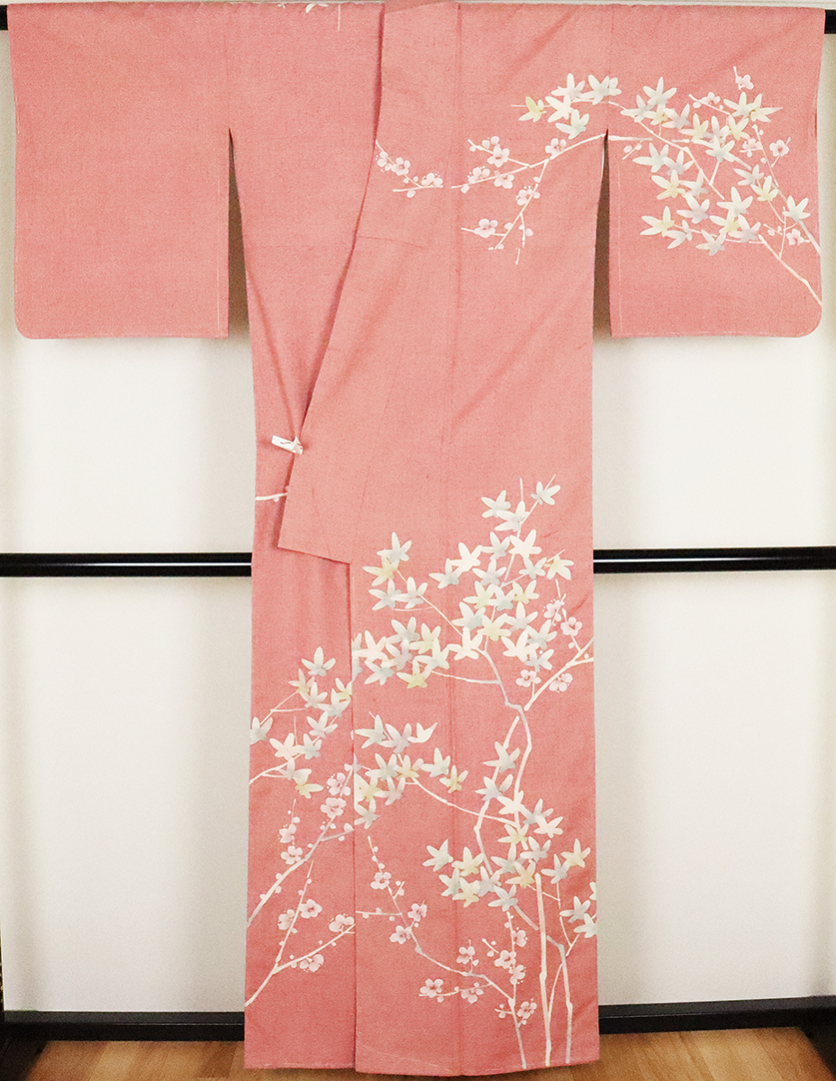 | 色・柄 | 手織り紬 訪問着 袷 ピンクかかった紫地 ローケツ梅・楓 (写真では上手く色が出ない場合があります。ご了承下さい) |