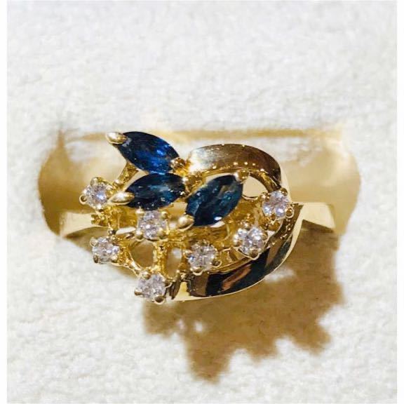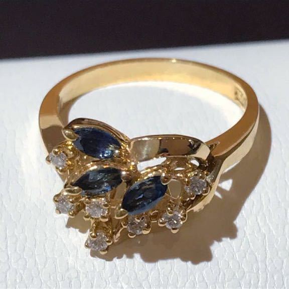 こちらは、YG750台にサファイア3石、メレーダイヤ7石付きのデザインリングです。