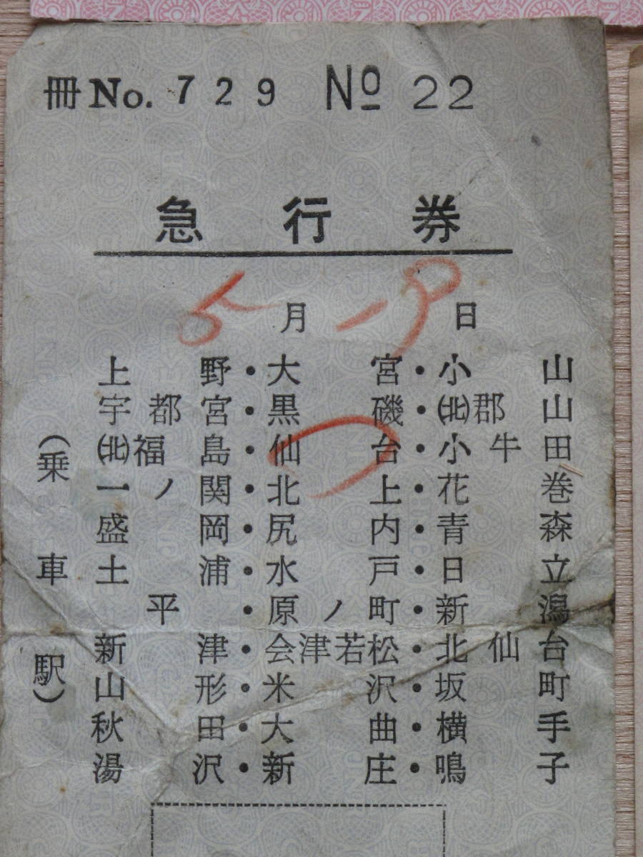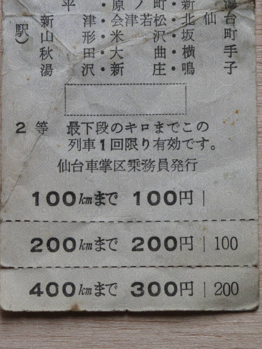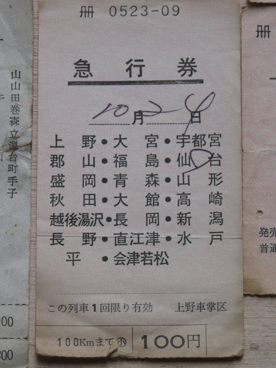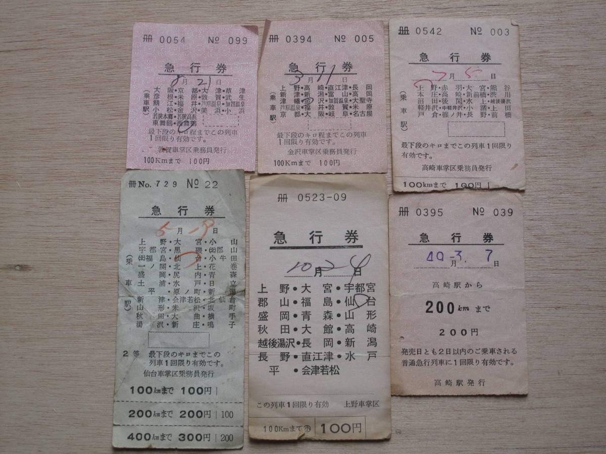 昭和40年代~同50年代に発行された、国鉄 急行券 計6枚です。 ① 昭和40年代、仙台車掌区乗務員 の発行した、2等 急行券 300円券です。下端にミシン目。「5月19日」の記入。乗車駅の「仙台」にチェック印。裏面は白紙。 ② 昭和49年3月7日の日付のある、高崎駅 の発行した、同駅からの 急行券 200円券です。下端にミシン目。パンチ穴1か所。裏面は白紙。 ③ 昭和50年前後、上野車掌区乗務員 の発行した、仙台駅からの 急行券 100円券です。下端にミシン目。「10月24日」の記入。裏面は白紙。 ④ 昭和50年前後、金沢車掌区乗務員 の発行した、金沢駅からの 急行券 100円券です。「 3月11日 」の記入。下端にミシン目。裏面は白紙。 ⑤ 昭和50年前後、敦賀車掌区乗務員 の発行した、西舞鶴駅からの 急行券 100円券です。「 8月21日 」の記入。下端にミシン目。裏面は白紙。 ⑥ 昭和50年前後、高崎車掌区乗務員 の発行した、上野駅からの 急行券 100円券です。「 7月5日 」の記入。下端にミシン目。裏面は白紙。 ①が淡青地、②~⑥が淡赤地で「JNR」「こくてつ」地紋。軟券。 サイズは①がタテ10.9cm×ヨコ5.1cm、②が8.0cm×5.4cm、③が10.4cm×5.5cm、④が6.5cm×5.2cm、⑤が6.3cm×5.2cm、⑥が7.3cm×5.4cm。 いずれも経年の変色・薄い汚れ・多くの折れ・多くの折れシワ・⑥の下端に小欠損があります。 定形郵便110円でお送りします。 ★保存状態の記述は、あくまで個人的な評価ですので、保存状態に厳しい方は、入札をご遠慮願います。