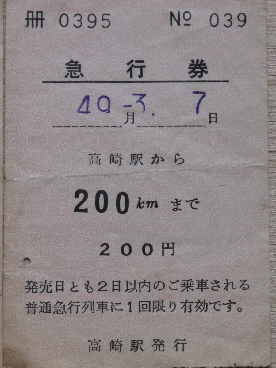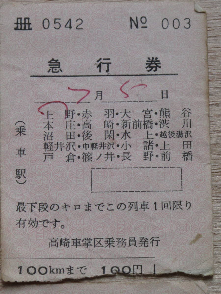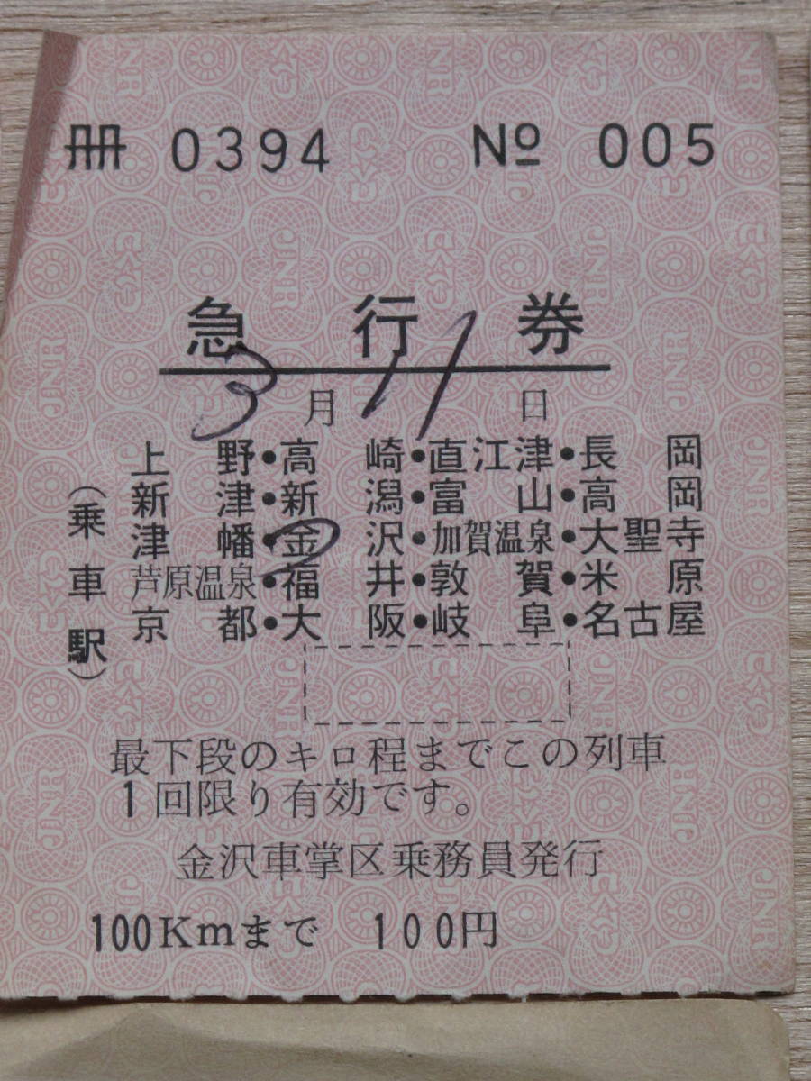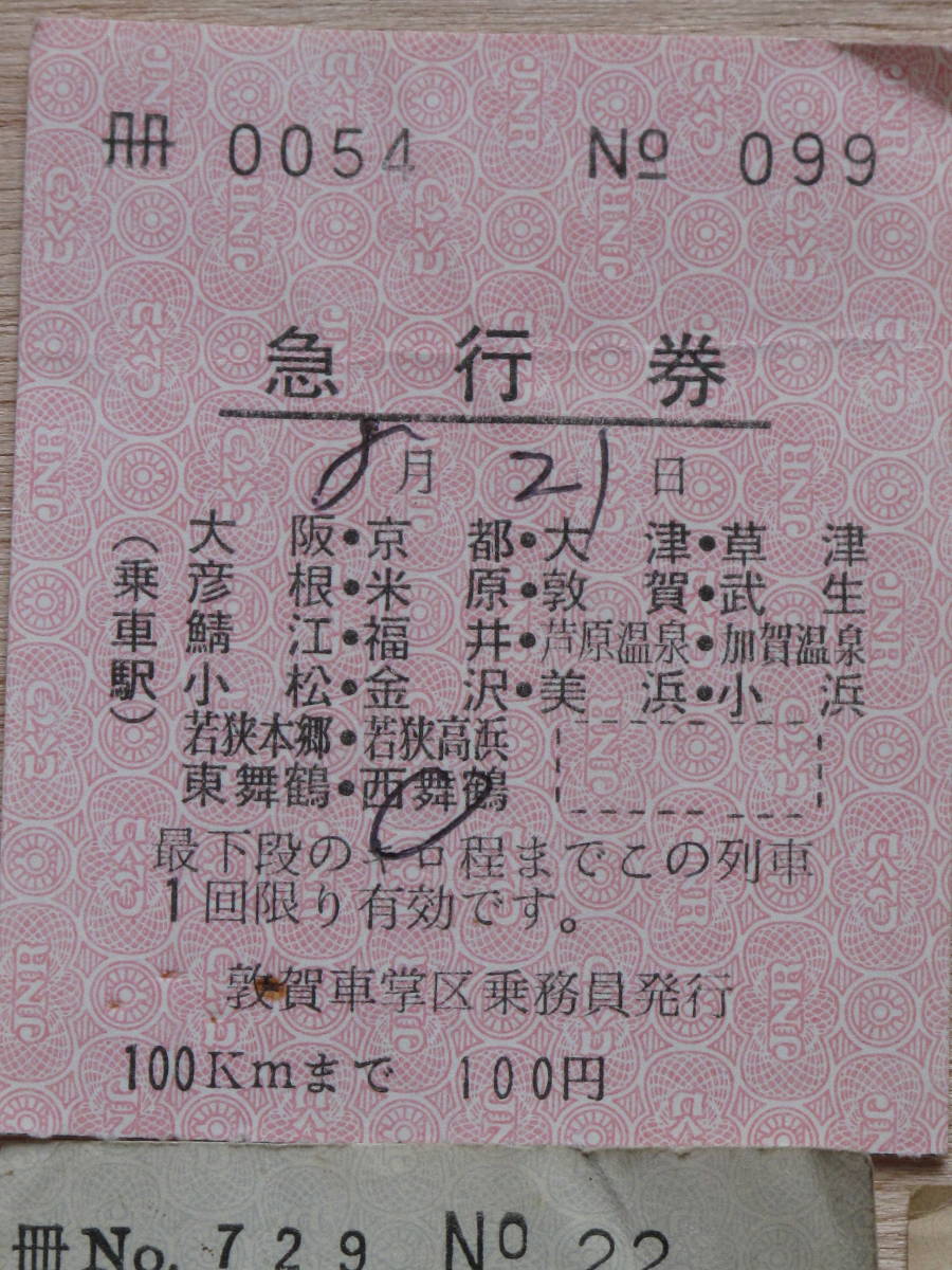昭和40年代~同50年代に発行された、国鉄 急行券 計6枚です。 ① 昭和40年代、仙台車掌区乗務員 の発行した、2等 急行券 300円券です。下端にミシン目。「5月19日」の記入。乗車駅の「仙台」にチェック印。裏面は白紙。 ② 昭和49年3月7日の日付のある、高崎駅 の発行した、同駅からの 急行券 200円券です。下端にミシン目。パンチ穴1か所。裏面は白紙。 ③ 昭和50年前後、上野車掌区乗務員 の発行した、仙台駅からの 急行券 100円券です。下端にミシン目。「10月24日」の記入。裏面は白紙。 ④ 昭和50年前後、金沢車掌区乗務員 の発行した、金沢駅からの 急行券 100円券です。「 3月11日 」の記入。下端にミシン目。裏面は白紙。 ⑤ 昭和50年前後、敦賀車掌区乗務員 の発行した、西舞鶴駅からの 急行券 100円券です。「 8月21日 」の記入。下端にミシン目。裏面は白紙。 ⑥ 昭和50年前後、高崎車掌区乗務員 の発行した、上野駅からの 急行券 100円券です。「 7月5日 」の記入。下端にミシン目。裏面は白紙。 ①が淡青地、②~⑥が淡赤地で「JNR」「こくてつ」地紋。軟券。 サイズは①がタテ10.9cm×ヨコ5.1cm、②が8.0cm×5.4cm、③が10.4cm×5.5cm、④が6.5cm×5.2cm、⑤が6.3cm×5.2cm、⑥が7.3cm×5.4cm。 いずれも経年の変色・薄い汚れ・多くの折れ・多くの折れシワ・⑥の下端に小欠損があります。 定形郵便110円でお送りします。 ★保存状態の記述は、あくまで個人的な評価ですので、保存状態に厳しい方は、入札をご遠慮願います。
