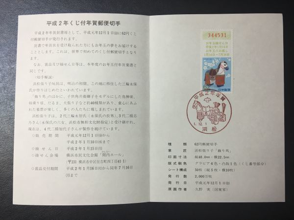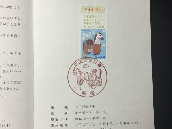 2323希少1990年用全日本郵便切手普及協会 年賀切手解説書 平成2年用うま62円浜松1.12.1FDC初日記念カバー使用済消印初日印記念印特印風景印
