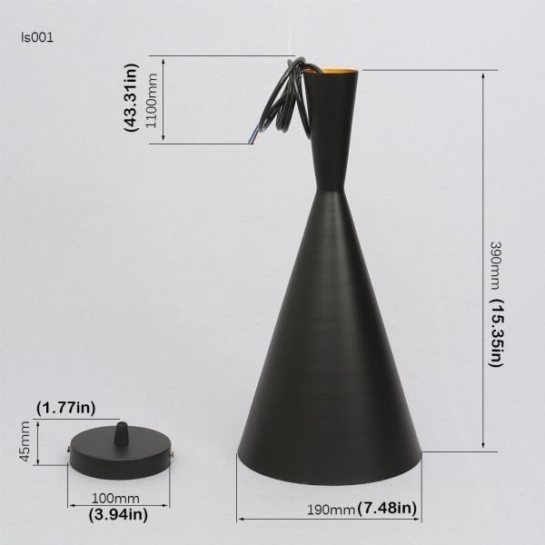 球根の数:1 電球ベース:E27 電球あたりのワット数:60ワット 電球含まれるか:電球含まれていません。 フィクスチャの材質:アルミニウム シェードの材質:アルミニウム デコレーション材質:アルミニウム フィクスチャの色:ブラック シェードカラー:ブラック デコレーションカラー:ブラック 外形寸法: フィクスチャ高さ48センチメートル フィクスチャ幅18センチメートル |