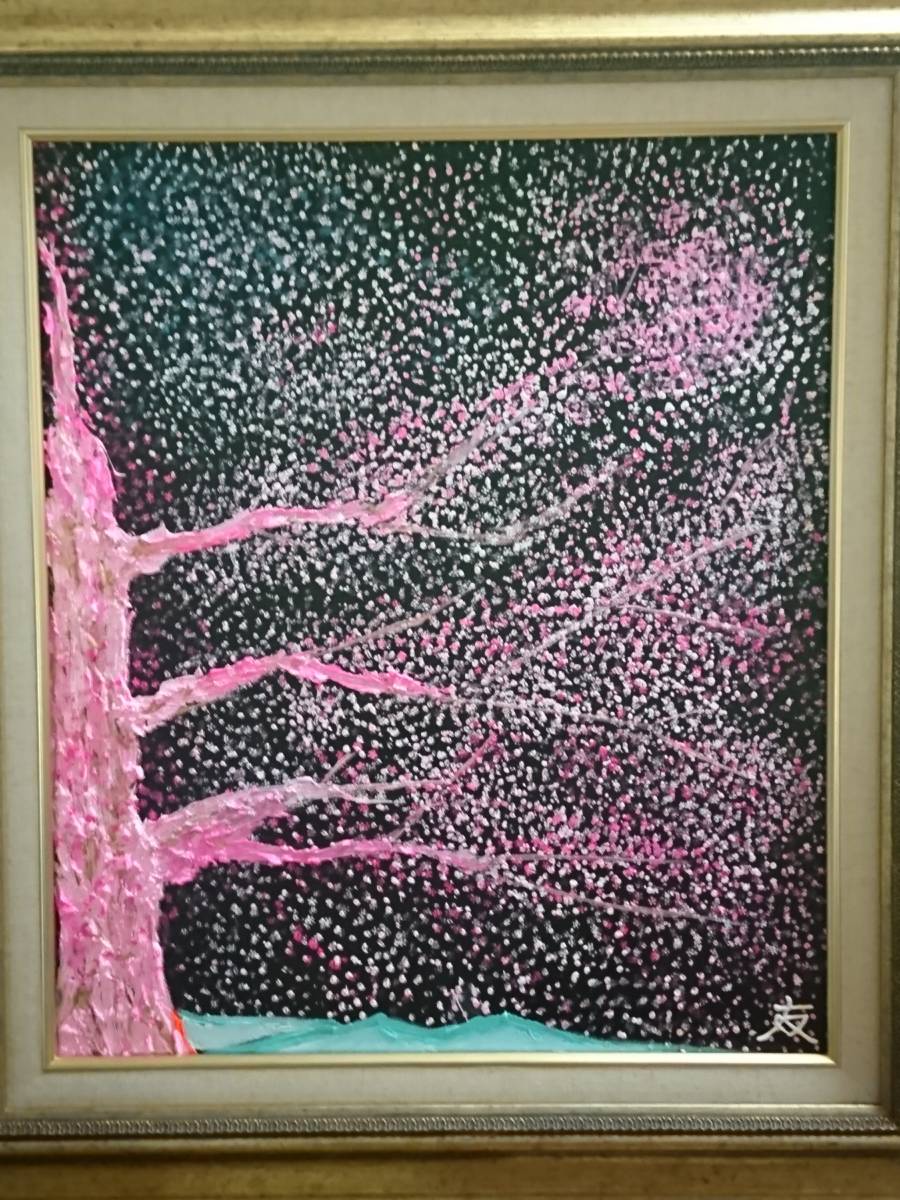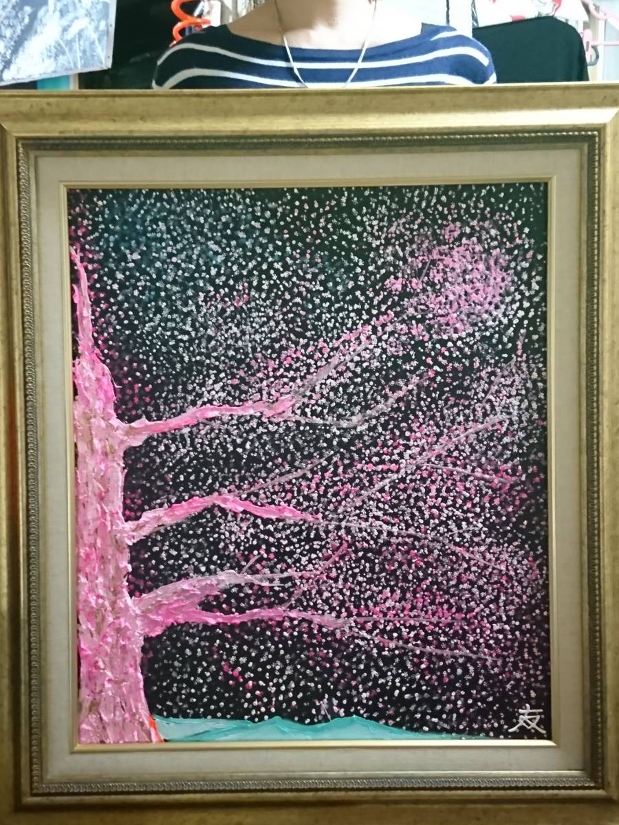 ≪国美協≫TOMOYUKI・友之、『夜桜・桜木』、油彩画、大判、F10号:53,0cm×45,5cm、一点物、新品高級油彩額付、直筆サイン・真作保証付