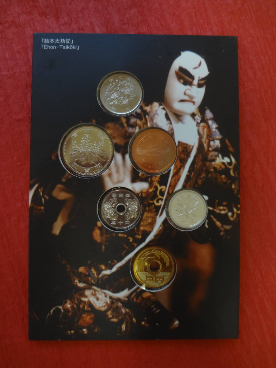 「歌舞伎」が200511月に第3回「人類の口承及び無形遺産の傑作の宣言」の傑作に選ばれたことを記念して、造幣局で製造した一度も使用していない平成18年銘の500円から1円まで計6枚の通常貨幣を、歌舞伎に関わるカラー写真と和・英文の説明文を入れた絵はがき型の特製ケースに収納したものです。