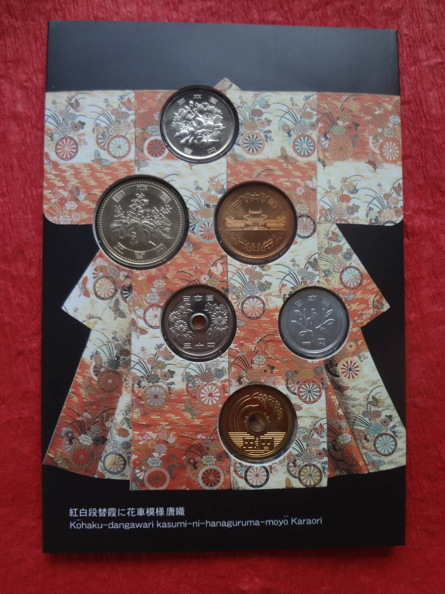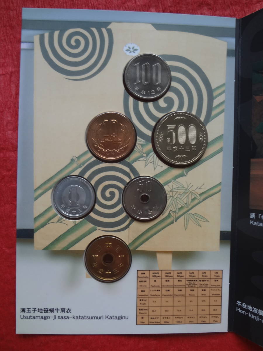 「能楽」が2001年に「人類の口承及び無形遺産の傑作の宣言」の第1回傑作に指定されたことを記念して、造幣局で製造した一度も使用していない平成13年銘の500円、100円、50円、10円、5円、1円貨幣各1枚をカラー写真(和・英文で説明)入りの絵はがき型ケースに収納したものです。