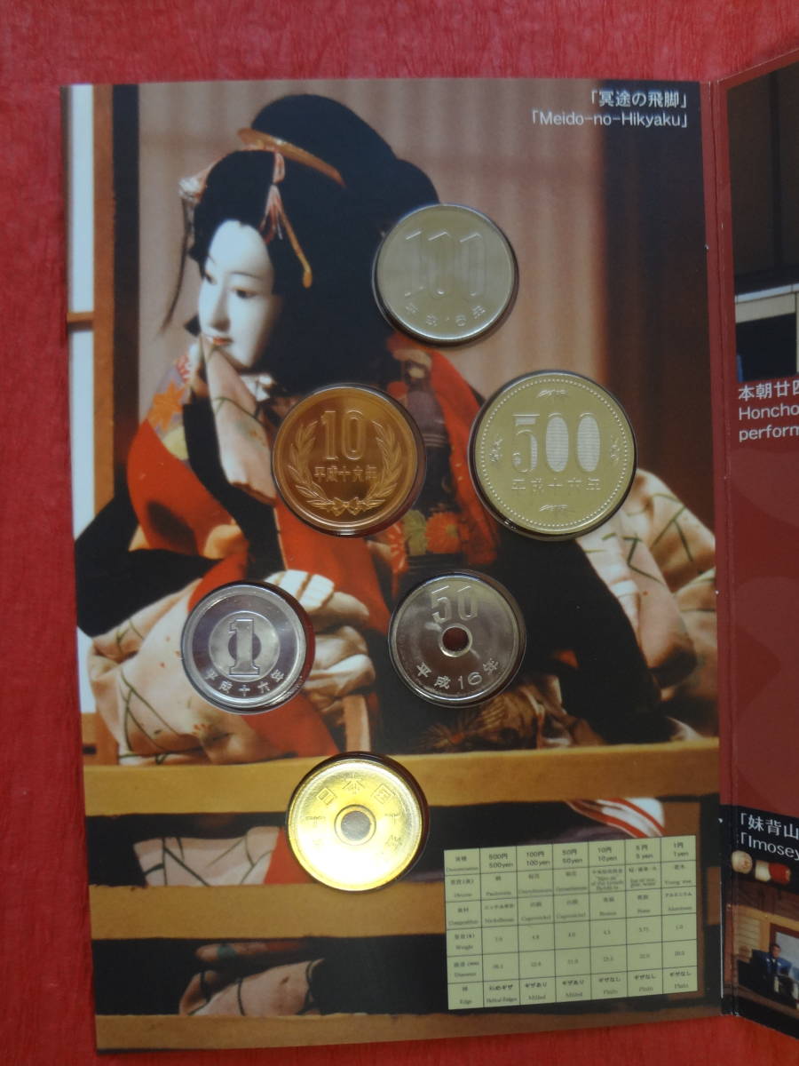 「人形浄瑠璃文楽」が200311月に「人類の口承及び無形遺産の傑作の宣言の傑作に選ばれたことを記念して、造幣局で製造した一度も使用していない平成16年銘の500円から1円まで計6枚の通常貨幣を、人形浄瑠璃文楽に関わるカラー写真と和・英文の説明文を入れた絵はがき型の特製ケースに収納したものです。