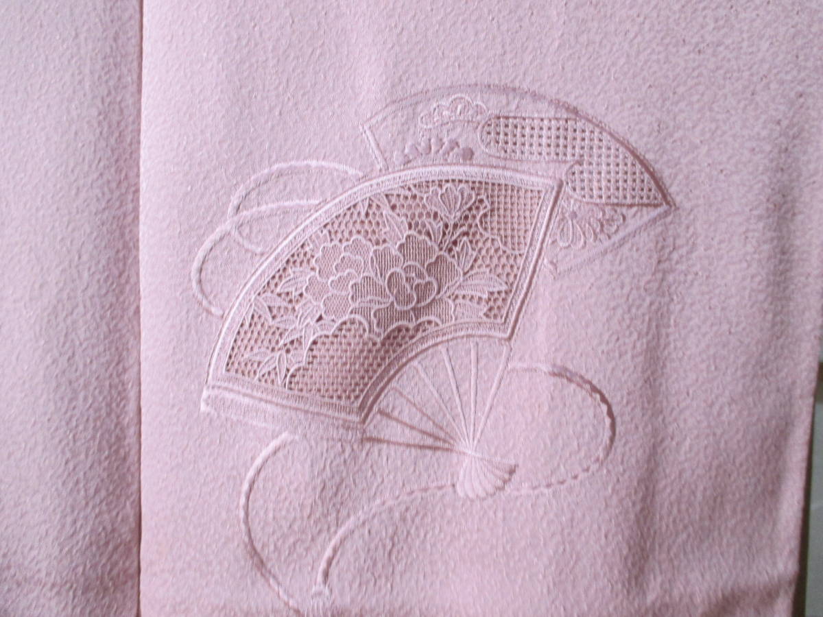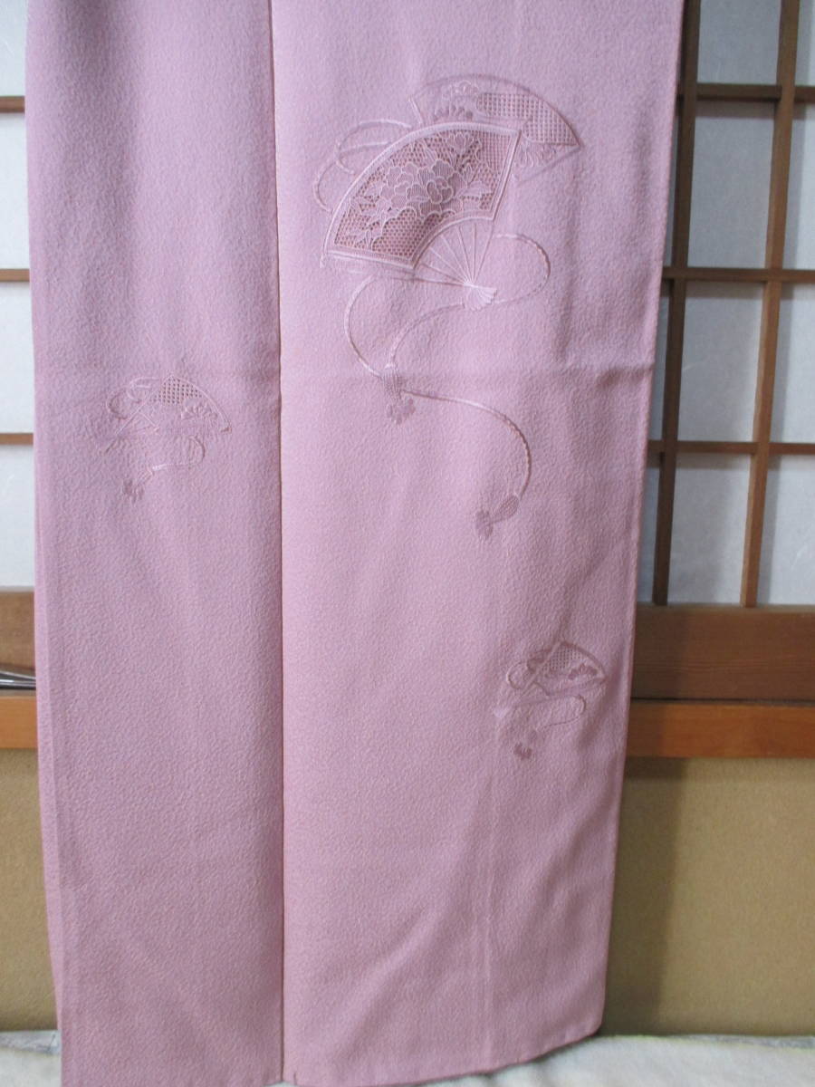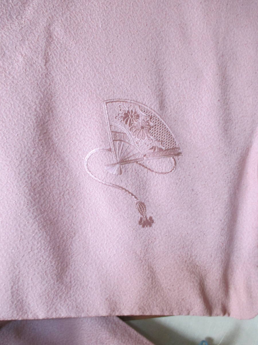上品な薄紫地に同色の扇面のスワトウ刺繍が施されて色無地にも使える出番多いお着物です。