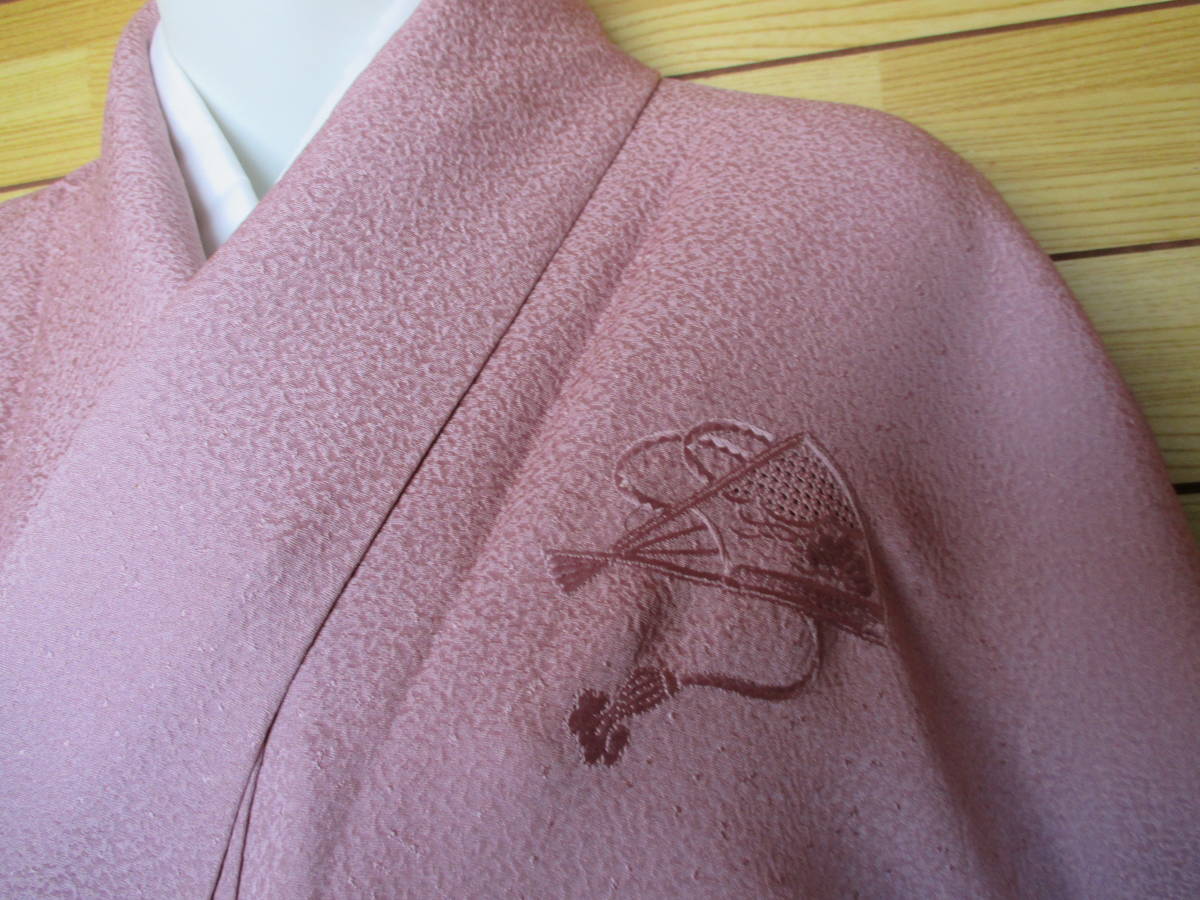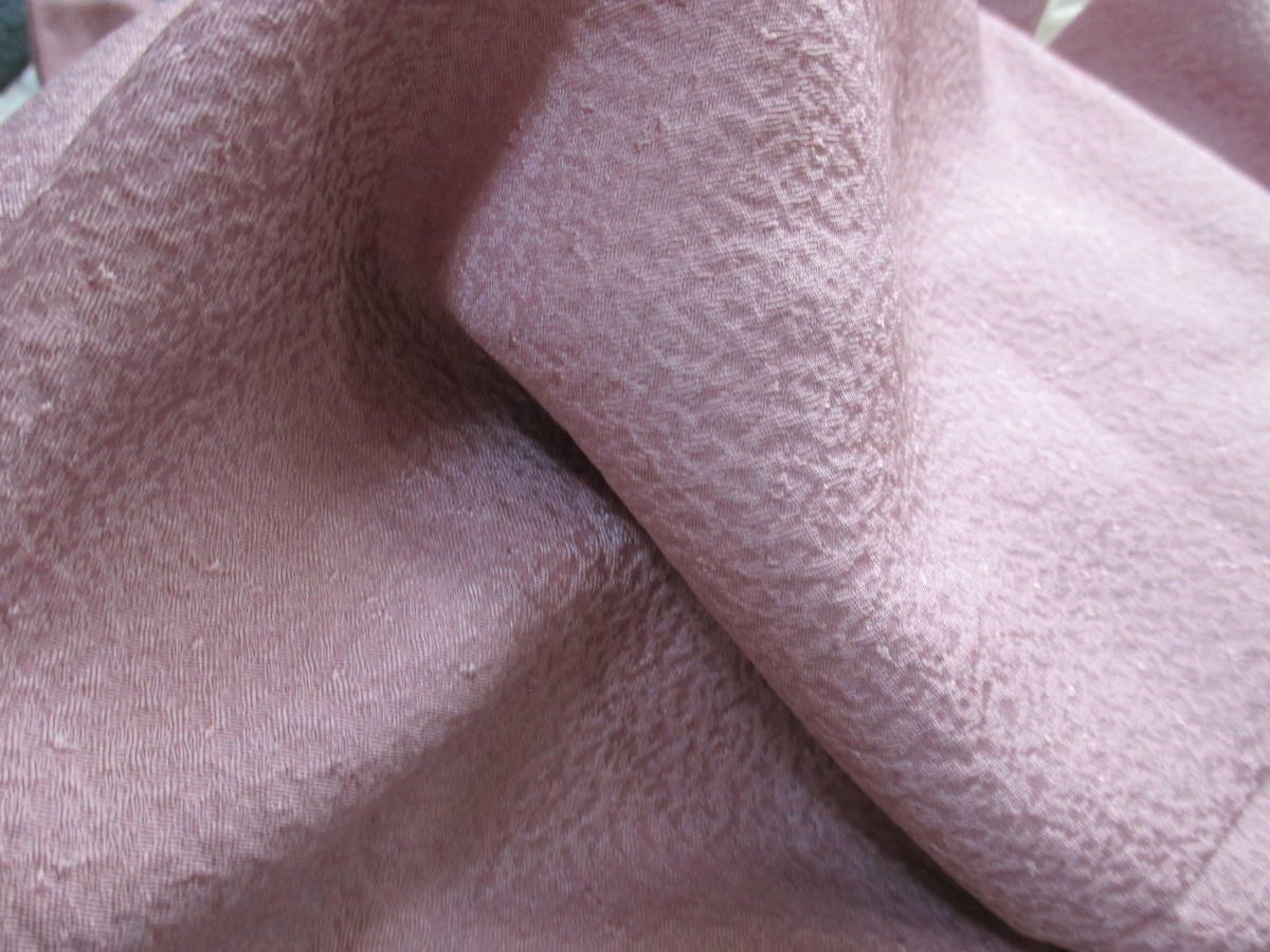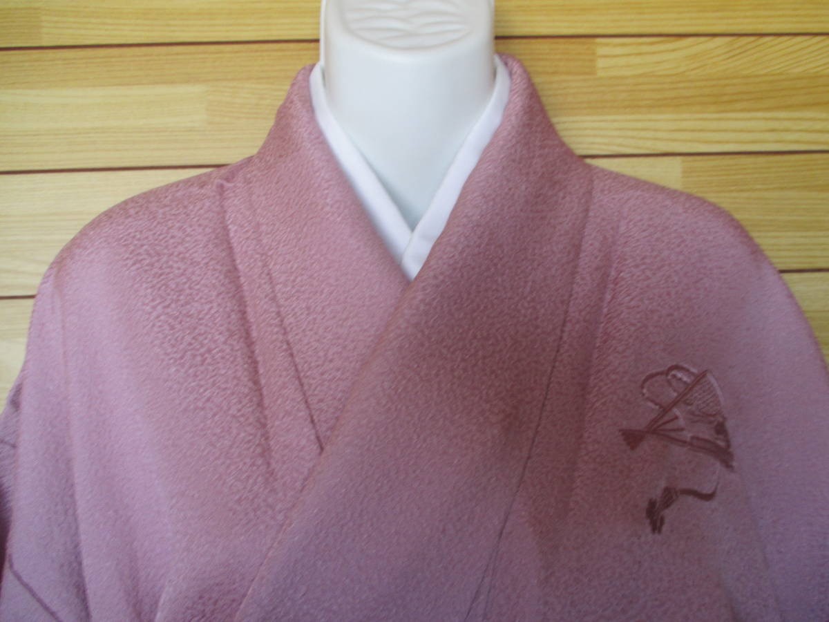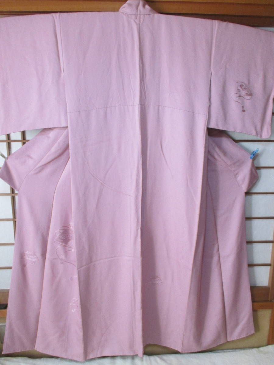 上品な薄紫地に同色の扇面のスワトウ刺繍が施されて色無地にも使える出番多いお着物です。