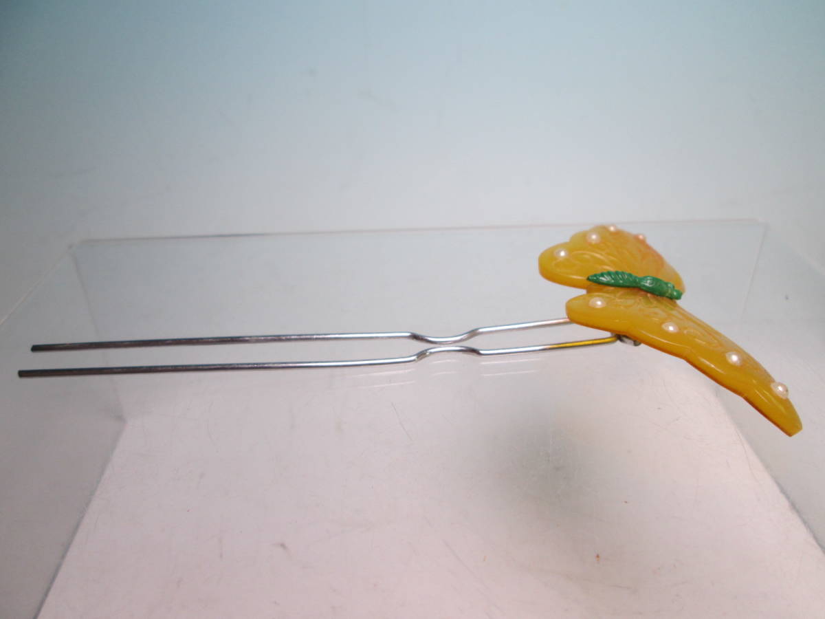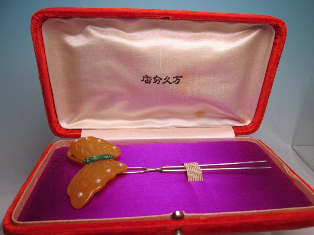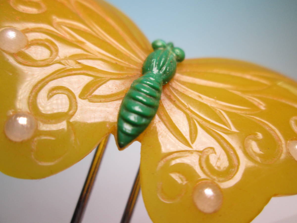 【江月】アンティーク・万久 緑砡本真珠飾りの蝶かんざし 共ケース付