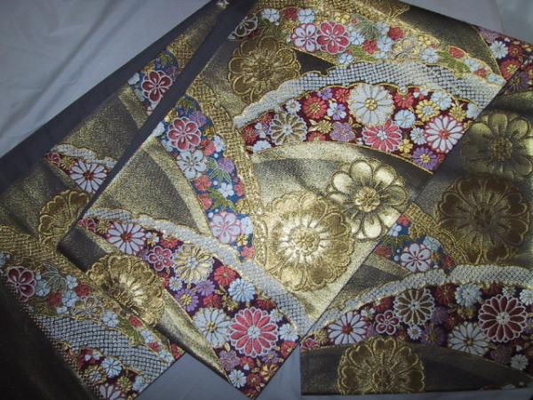 京都西陣 じゅらく の 若向きよう(振袖、訪問着、付け下げ、無地、小紋、など向き)のTOPブランド品『花かるた(花かおり)、粋元禄』ブランドです。6通柄袋帯 新品未仕立て品、絹100%金属糸等使用  こいめはいに金色のの生地に はなはな、、、
