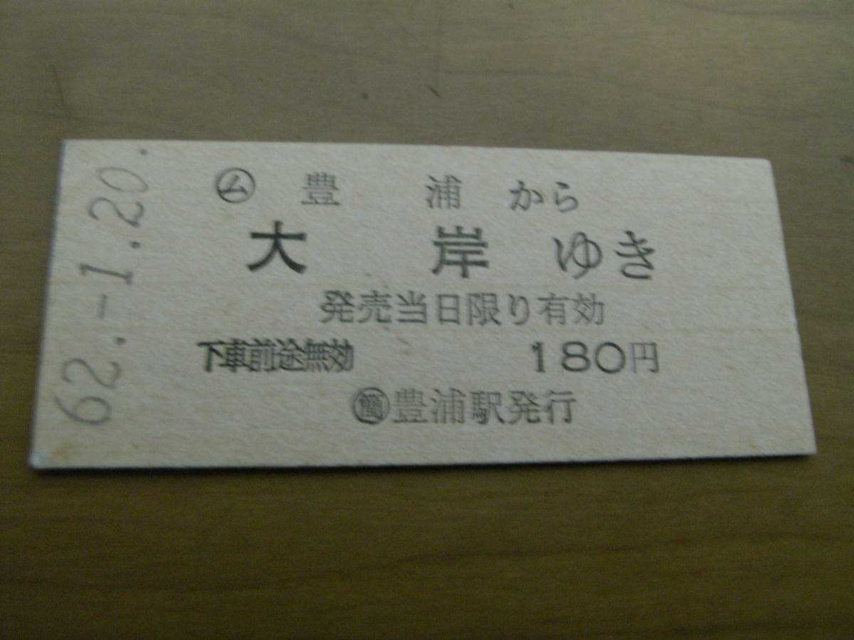 室蘭本線 ム豊浦から大岸ゆき 180円 昭和62年1月20日 簡 豊浦駅発行
