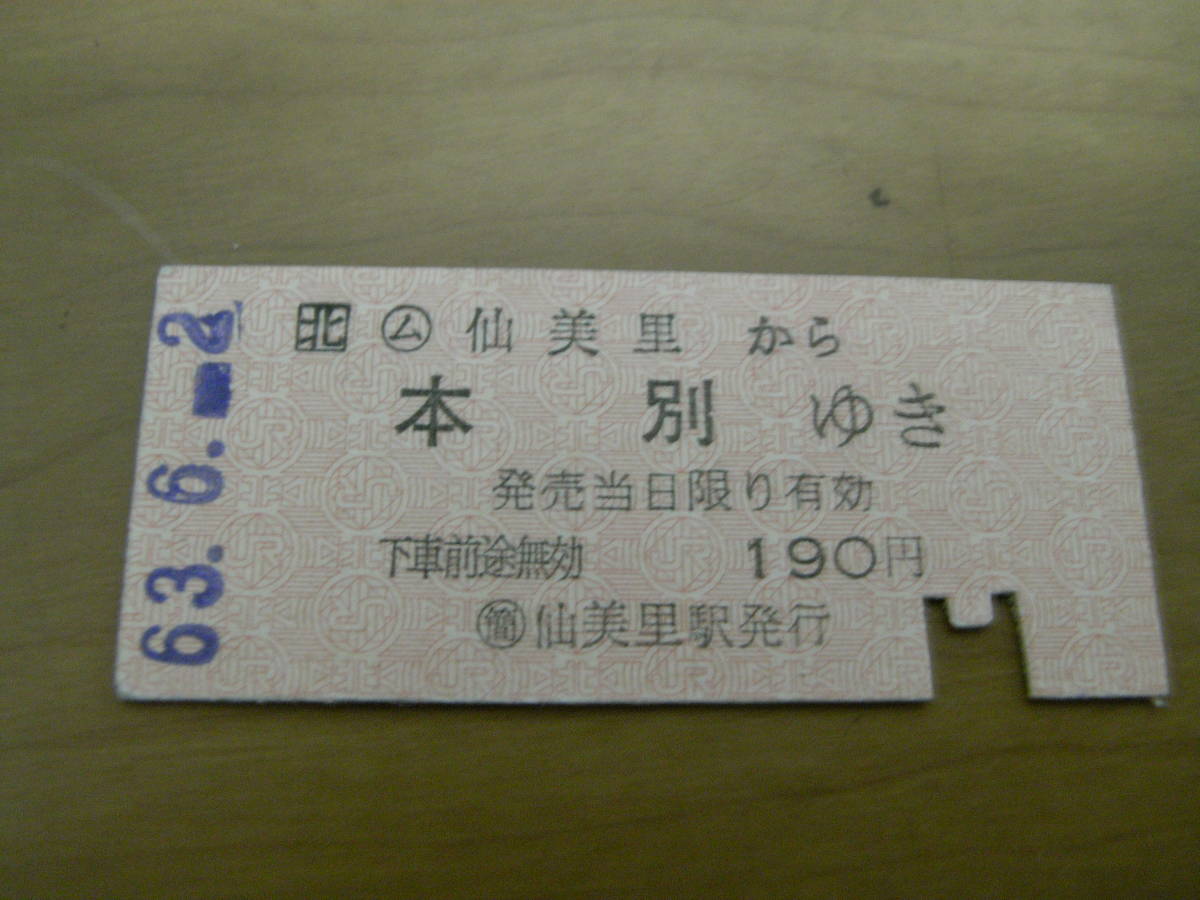 池北線 ム仙美里から本別ゆき 190円 昭和63年6月2日 簡 仙美里駅発行