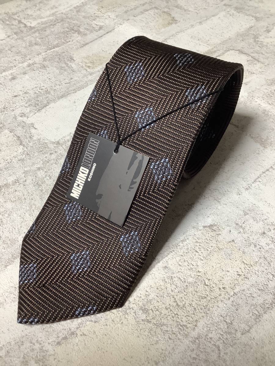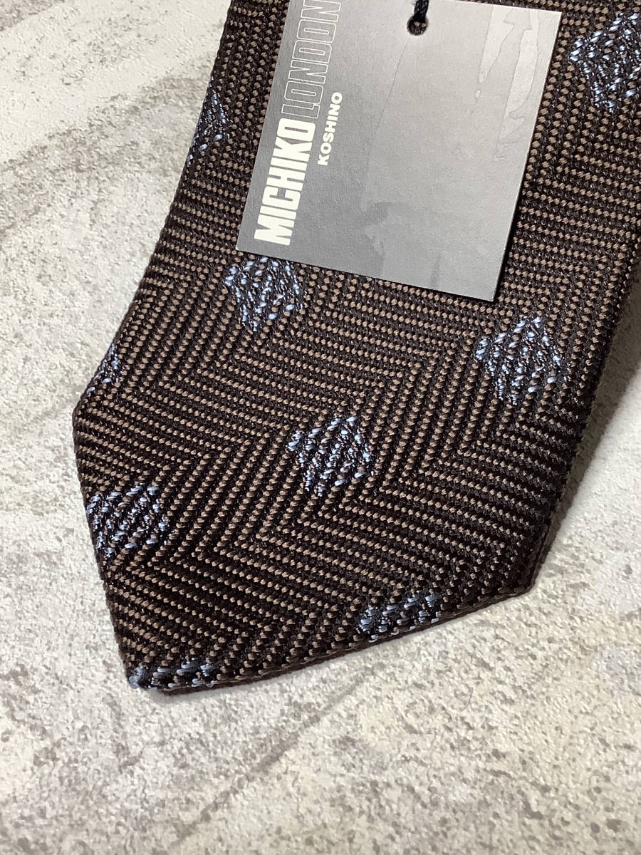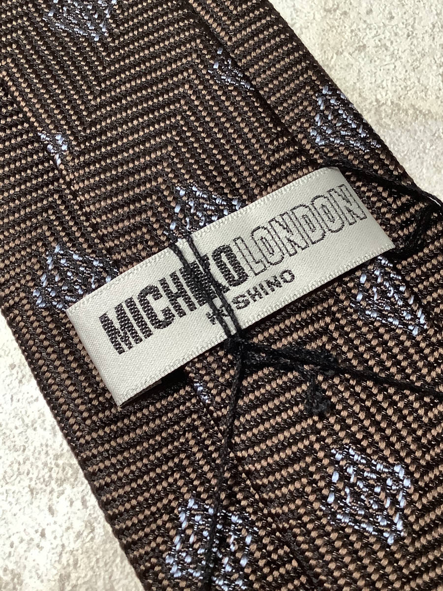 新品ミチコロンドン日本製ネクタイ 大人のブラウン 茶系の和柄風  シルク100%お買い得サービス