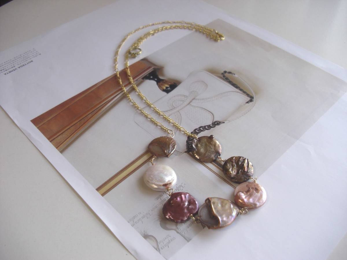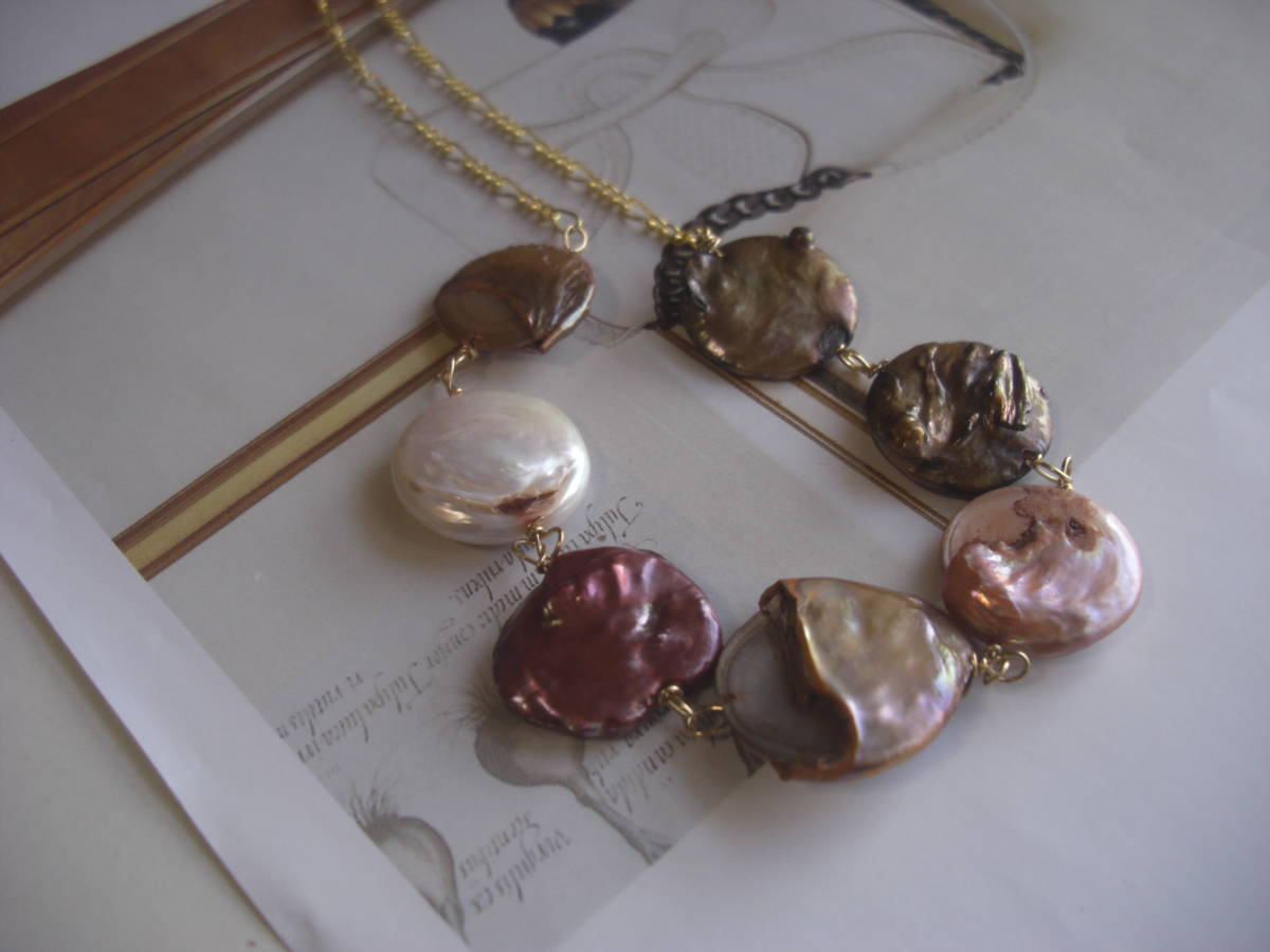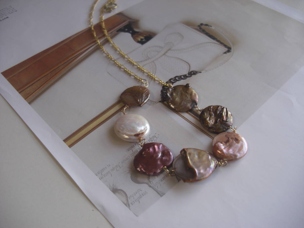 シックな薔薇を集めて・・シリーズです♪アートするパール・・個性的な表情のパールを紡いで存在感のあるネックレスです♪18ミリ位のコイン型のパールにデザインチェーンを合わせました♪長さは全長78センチ位で調節自由です♪チョーカー風にされても素敵です♪お揃いのブレスレットも出品しています♪シンプルで長く着けていただけるデザインを考えて作りました♪ハンドメイド をご理解頂いてノークレーム、ノーリターンでお願いします