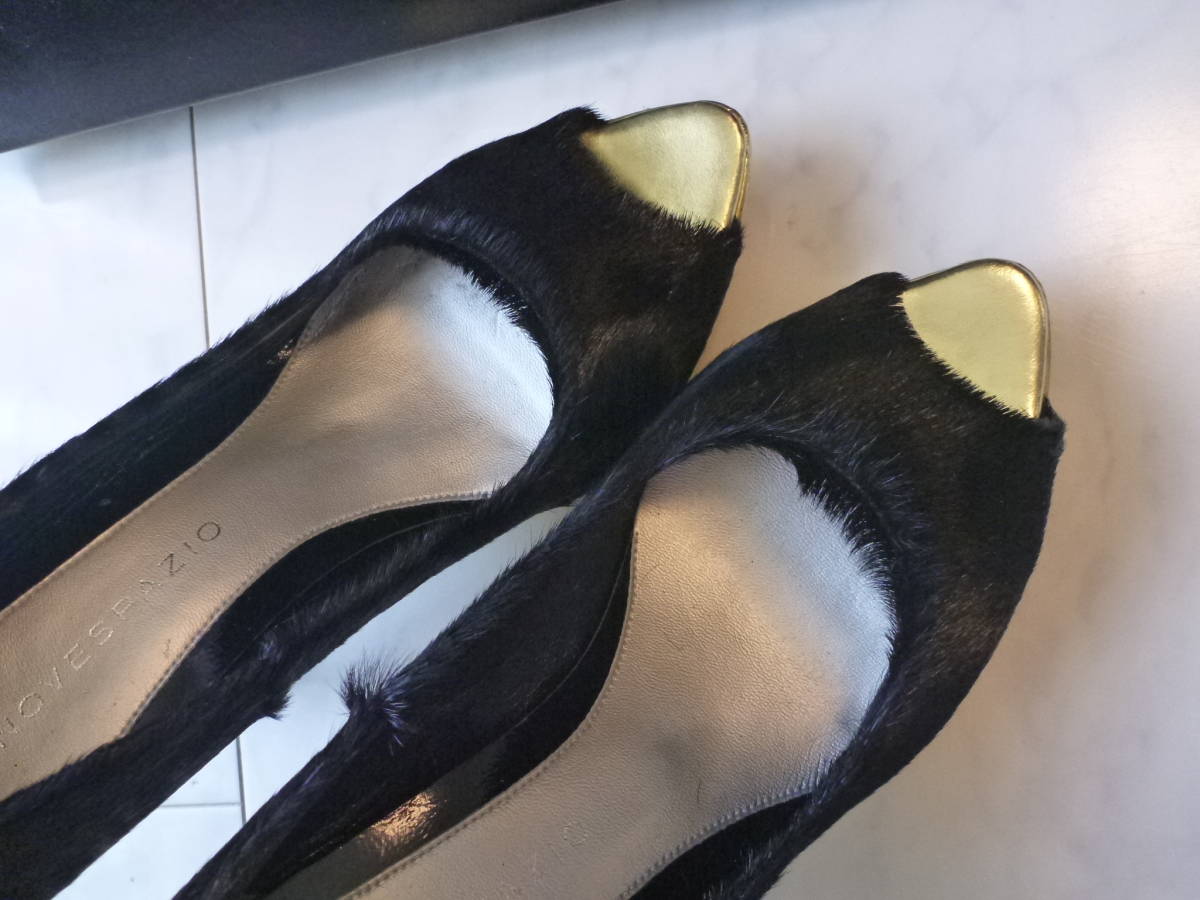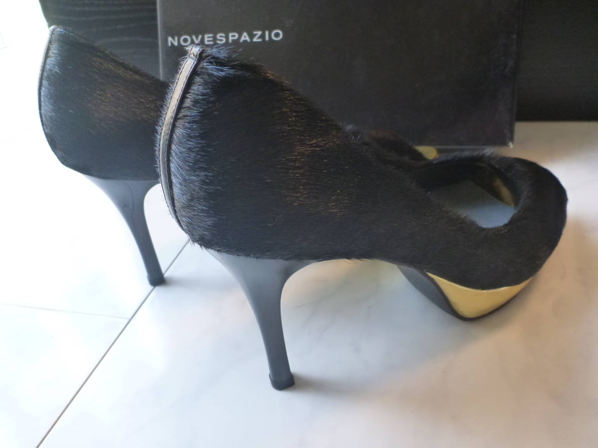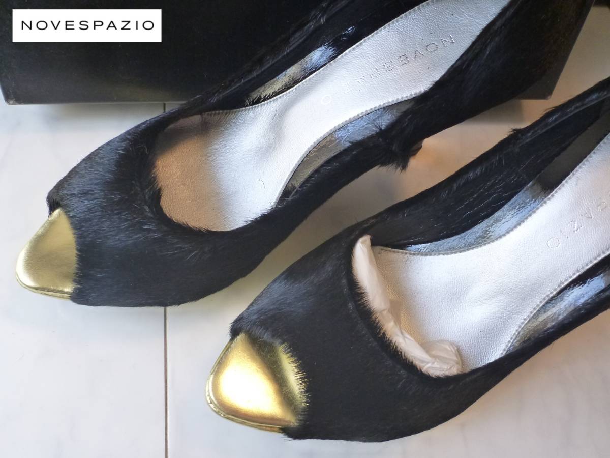 3万 新品 NOVESPAZIO ノーベスパジオ ★高級ハラコ 黒×ゴールド オープントゥパンプス 23