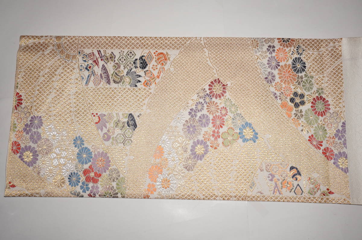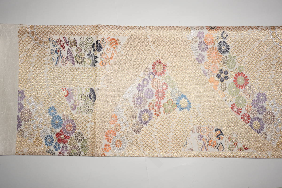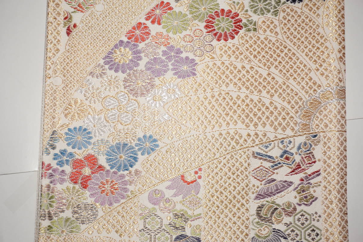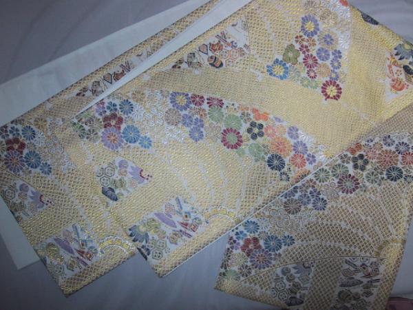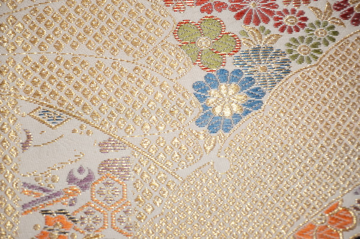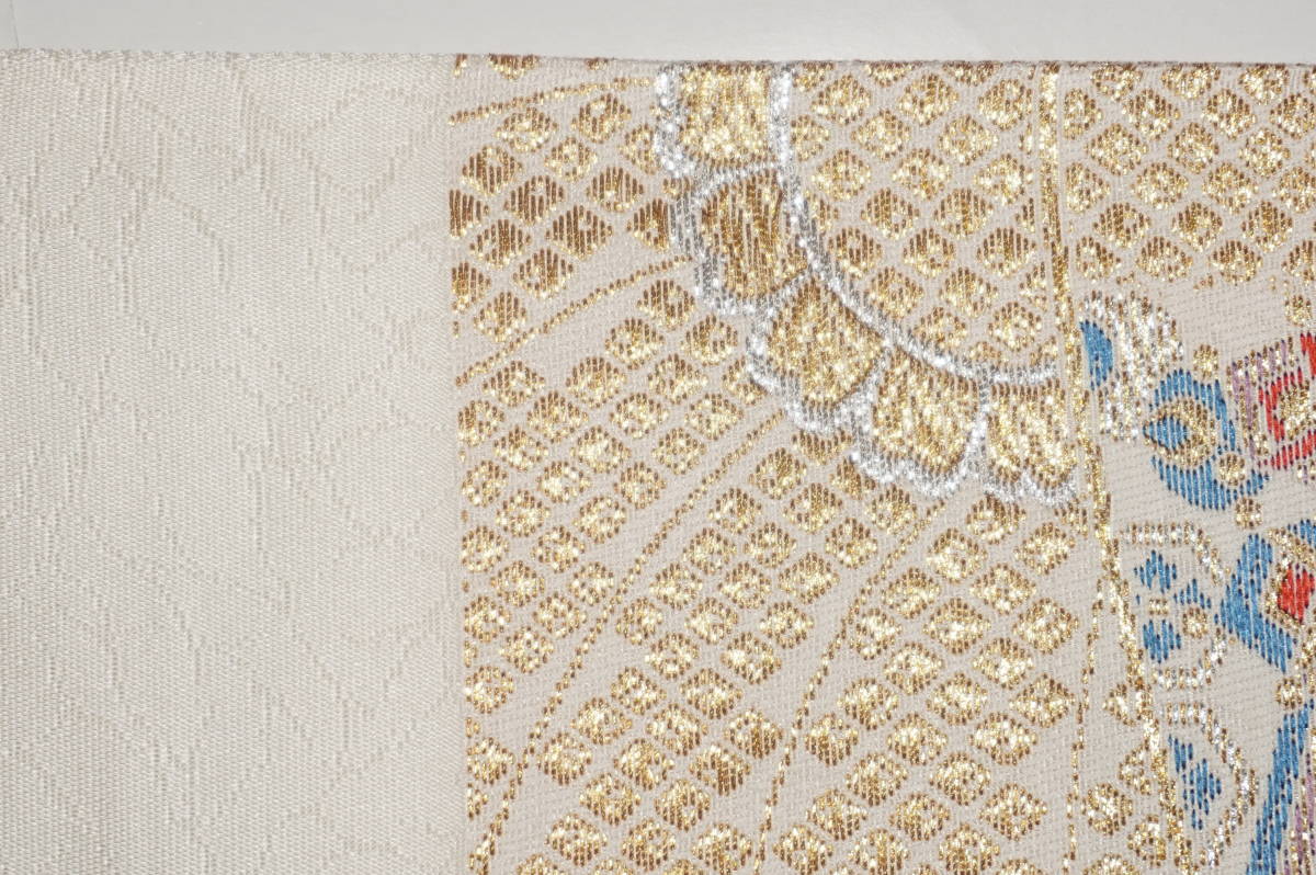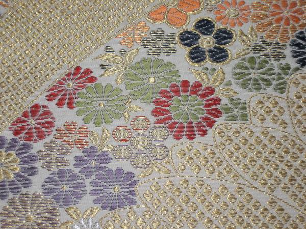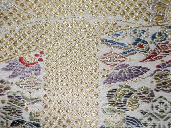 なお、帯柄左上に無地で出ているところは裏無地で、柄と柄の間に出ているところは手先と前太鼓のあいだの無地部分です。六通柄です。金銀糸が多用されているためストロボの照りで、しろぽく写っている部分があります。