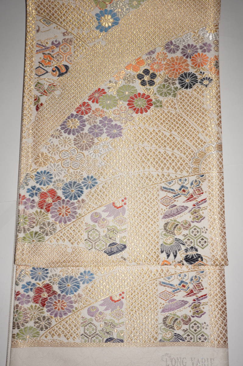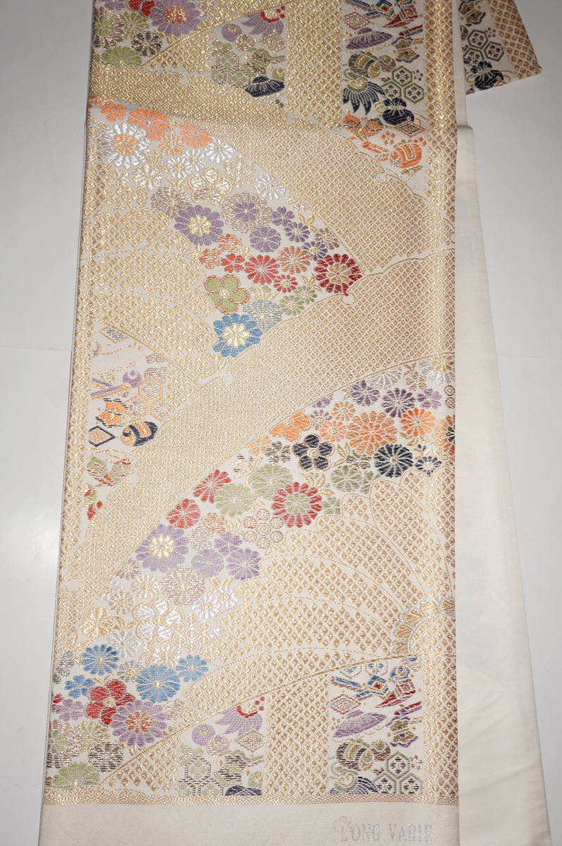 仕立てつき振袖用帯(ロング) 西陣6通柄袋帯(通常帯より約4寸長い) 絹100%金属糸等使用  白系色(裏地は白色) 新品み仕立て品ですがこのお値段で仕立てつきで、納品です。なお、最終日まで待っていただかなくとも、入札した時点でオークションは終了し落札者となります。お値段的にもお安く設定いたしましたお買い得品です(西陣帯です)。もちろん綿芯込みの仕立て付きですが、仕立てなしの場合でも金額は変わりません。